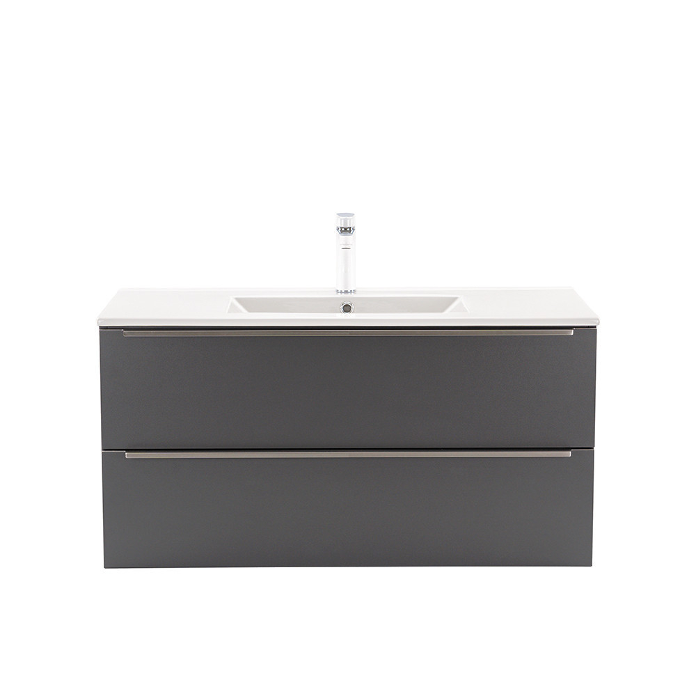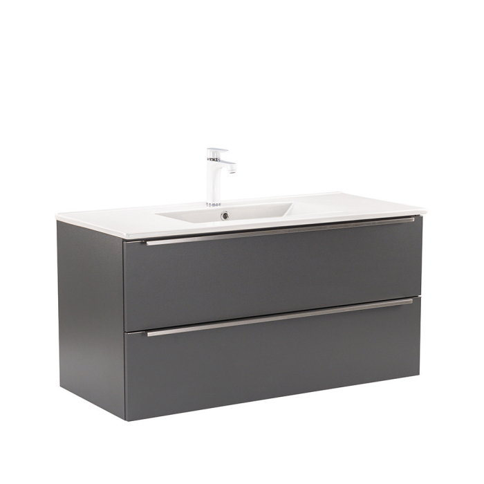 Mobilierul complet de baie Vario Trim 100 este o alegere elegantă și practică pentru o baie modernă. Dimensiunile sale compacte sunt ideale pentru băi mici și medii, iar profilul metalic al mânerului conferă un efect de patină, în timp ce designul antracit-antracit conferă spațiului un aspect elegant. Sertarul cu închidere silențioasă și designul suspendat oferă confort și curățare ușoară, în timp ce materialele de calitate asigură o durată lungă de viață.