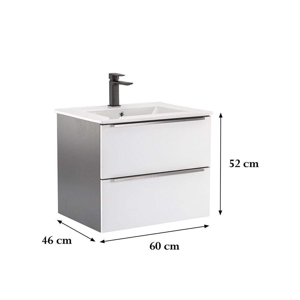 Mobilierul complet de baie Vario Trim 60 este o alegere elegantă și practică pentru o baie modernă. Dimensiunile sale compacte sunt ideale pentru băi mici și medii, iar profilul metalic al mânerului conferă un efect de patină, în timp ce designul alb-antracit conferă spațiului un aspect elegant. Sertarul cu închidere silențioasă și designul suspendat oferă confort și curățare ușoară, în timp ce materialele de calitate asigură o durată lungă de viață.