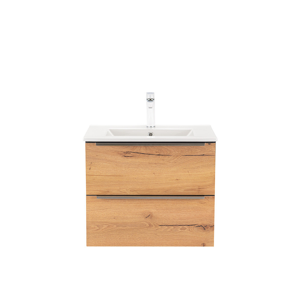 Setul complet de mobilier de baie Vario Trim 60 este o alegere elegantă și practică pentru o baie modernă. Dimensiunile sale compacte sunt ideale pentru băi mici și medii, iar profilul metalic al mânerului conferă un efect de patină, în timp ce designul antracit-stejar conferă spațiului un aspect elegant. Sertarul cu închidere silențioasă și designul suspendat oferă confort și curățare ușoară, în timp ce materialele de calitate asigură o durată lungă de viață.