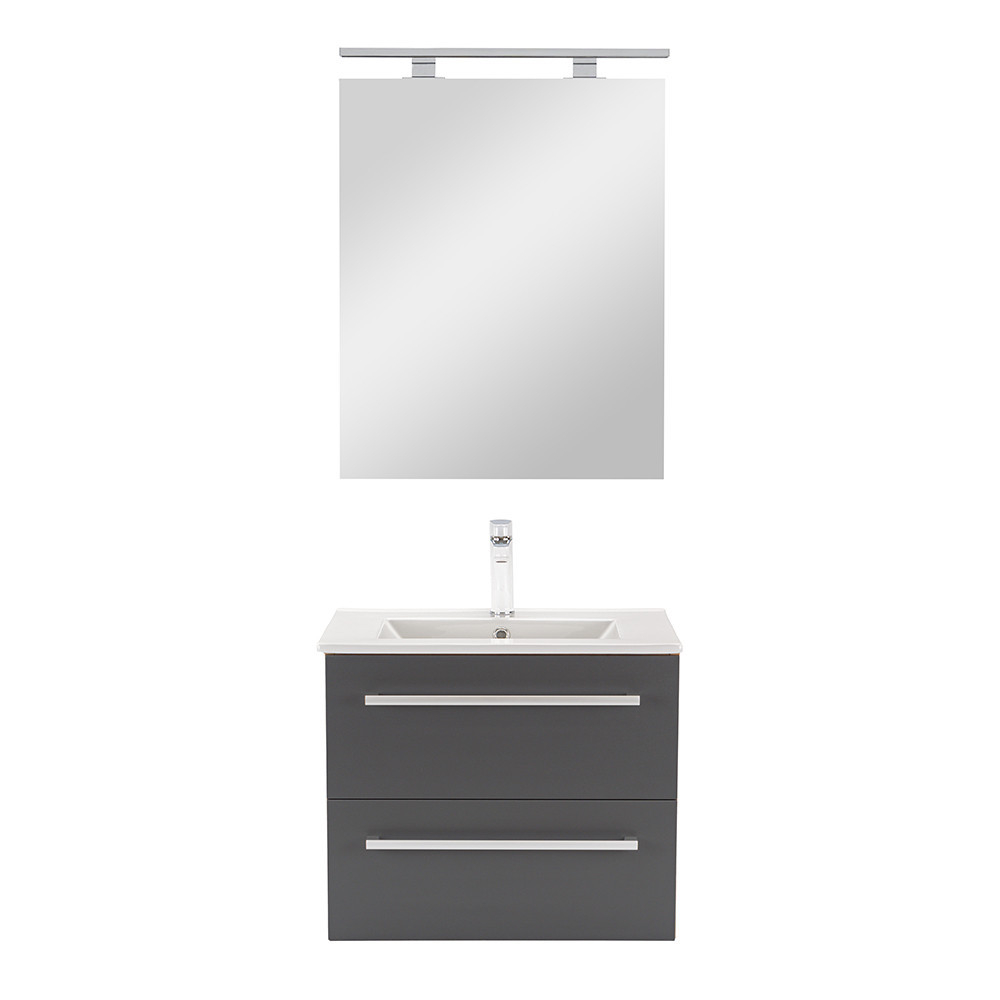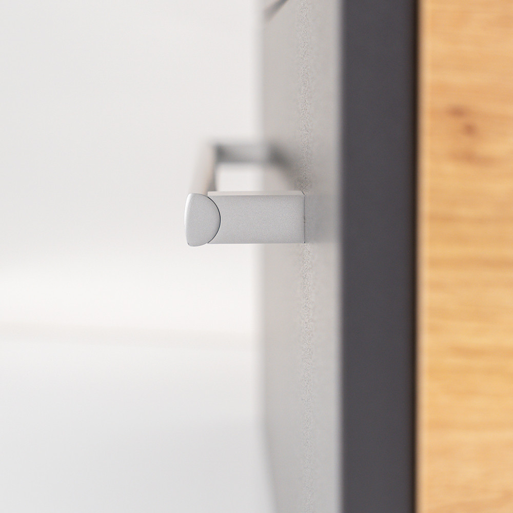Mobilierul complet de baie Vario Clam 60 este o alegere elegantă și practică pentru o baie modernă. Dimensiunile sale compacte sunt ideale pentru băi mici și medii, iar profilul metalic al mânerului conferă un efect de patină, în timp ce designul stejar-antracit conferă spațiului un aspect elegant. Sertarul cu închidere silențioasă și designul suspendat oferă confort și curățare ușoară, în timp ce materialele de calitate asigură o durată lungă de viață.