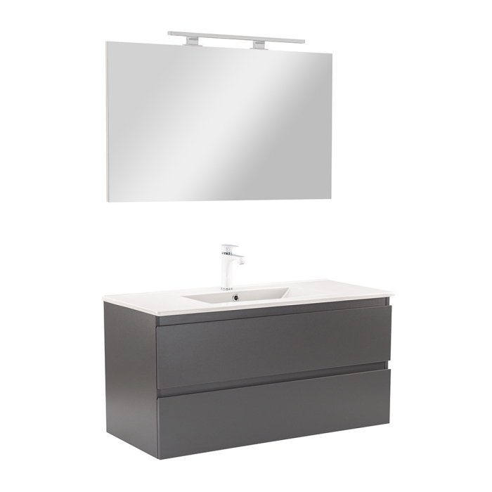 Mobilierul complet de baie Vario Forte 100 este o alegere elegantă și practică pentru o baie modernă. Dimensiunile sale compacte sunt ideale pentru băi mici și medii, iar designul antracit-antracit conferă spațiului un aspect elegant. Sertarul cu închidere silențioasă și designul suspendat oferă confort și curățare ușoară, în timp ce materialele de calitate asigură o durată lungă de viață.