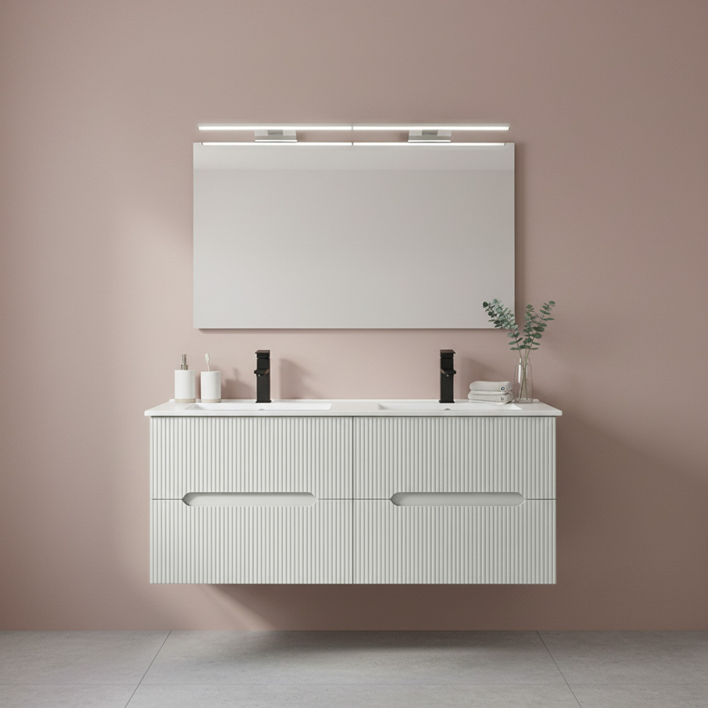 Iar partea frontală cu nervuri are un profil rotunjit, ceea ce o face ușor de păstrat curată cu o cârpă din microfibră. Oglinda este livrată fără iluminare - este disponibilă o lumină LED opțională - iar suporturile de agățare pentru montarea pe perete sunt incluse.