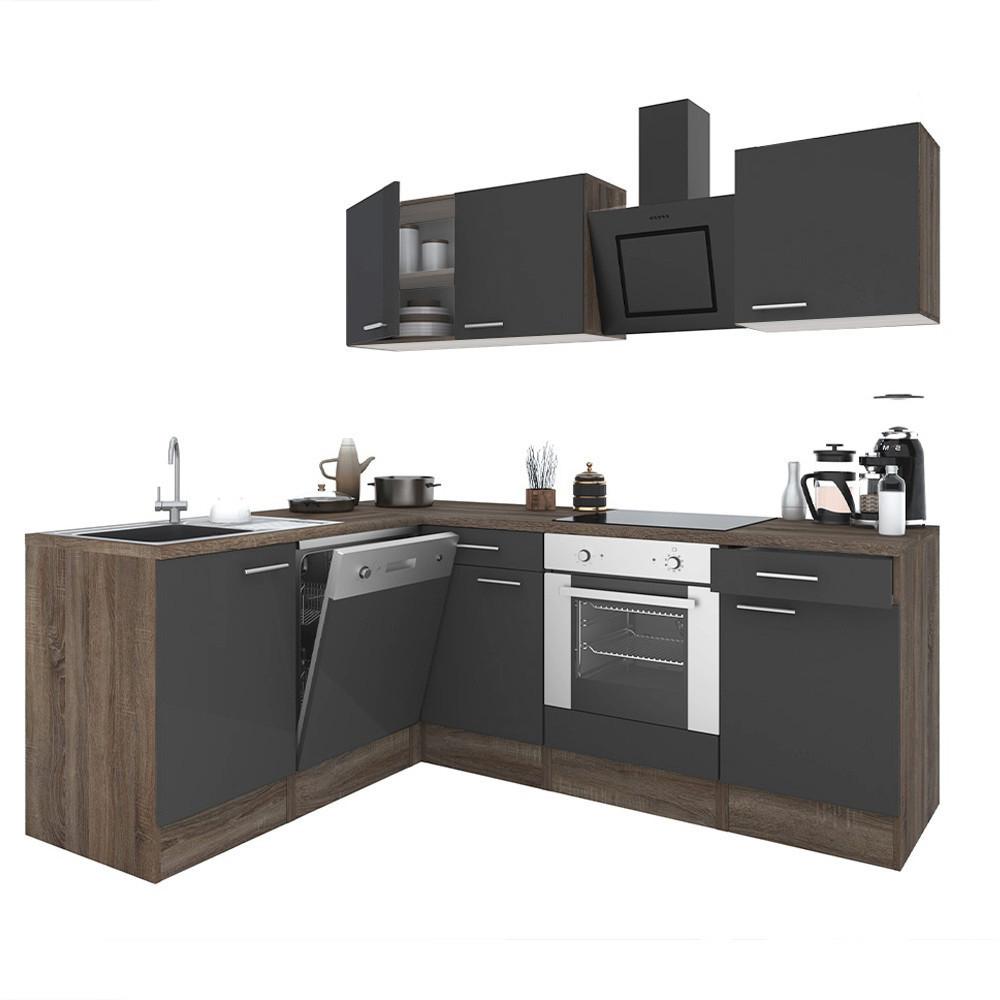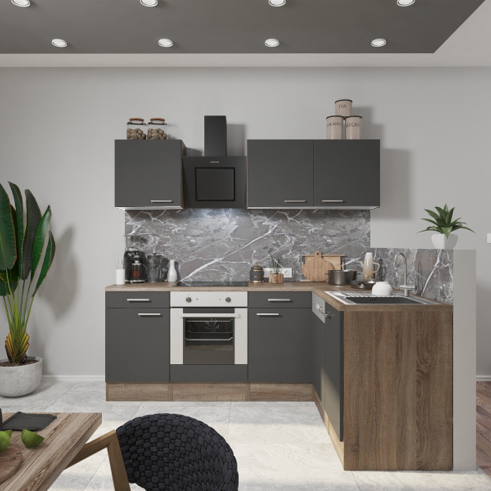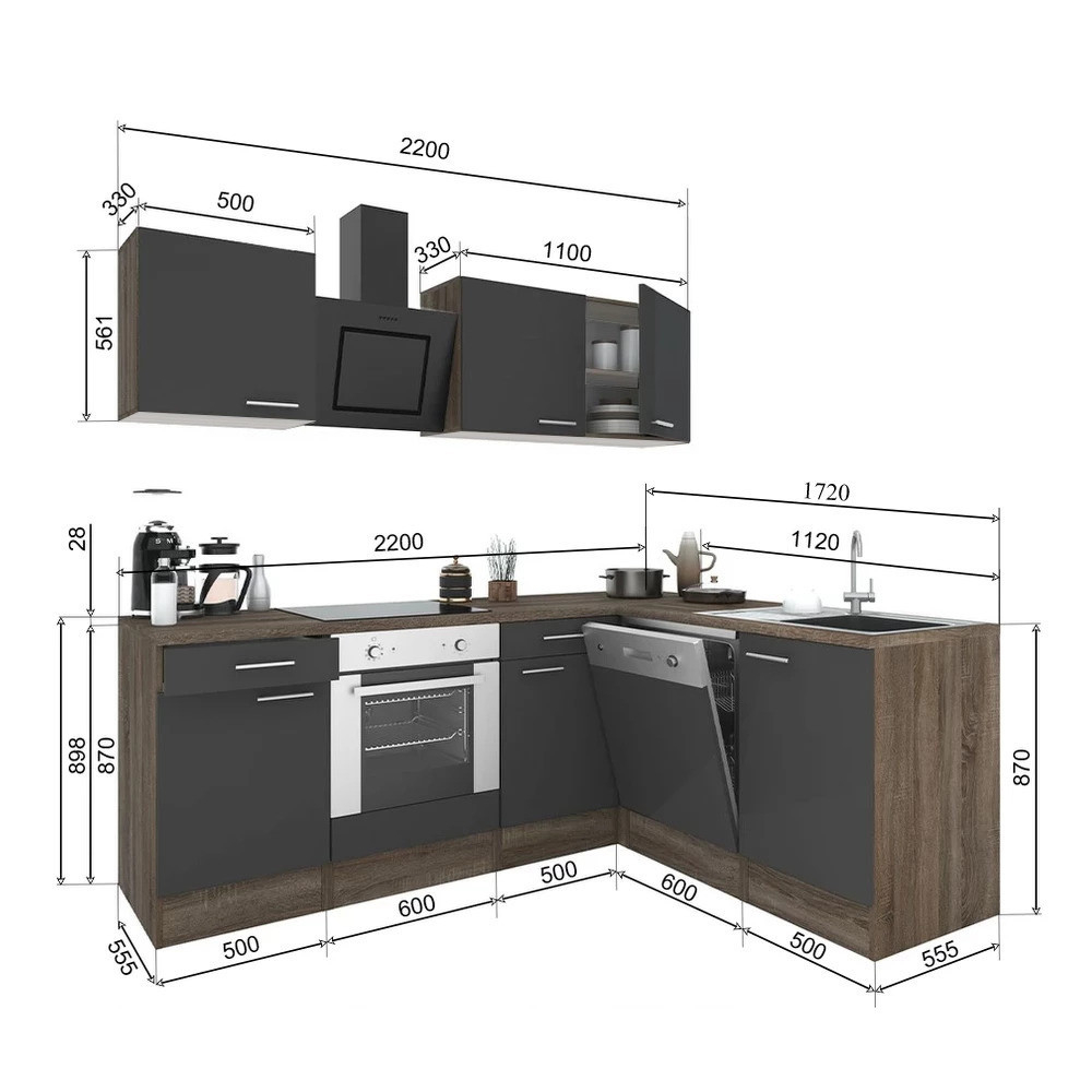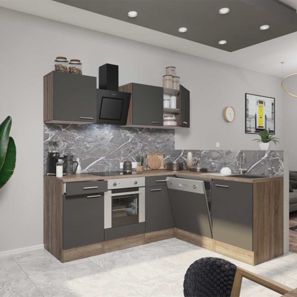 Mobilier de bucătărie modular de înaltă calitate, produs în țară, care va satisface nevoile oricărui client. Corp realizat din placă laminată pentru mobilier de 16 mm , de culoare stejar York. Când este asamblat, pinii ombilicali și șuruburile de confirmare îl fac suficient de solid. Blatul de lucru este fabricat peste elemente și are o grosime de 28 mm .