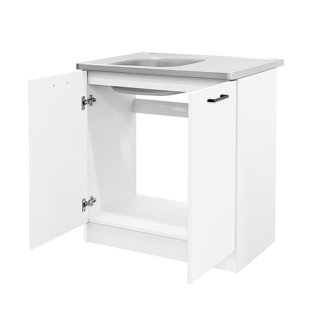 Dimensionarea bine gândită a unității inferioare oferă spațiu suficient pentru o tavă de chiuvetă și un sifon. Designul fără rafturi permite instalații sanitare convenabile, în timp ce interiorul dulapului poate fi folosit în continuare pentru a depozita produse de curățare sau alte ustensile de bucătărie. Lățimea dulapului este optimă pentru bucătăriile mici și moderne, dar este, de asemenea, o unitate de bază practică ca parte a unui ansamblu mai mare de mobilier de bucătărie.
