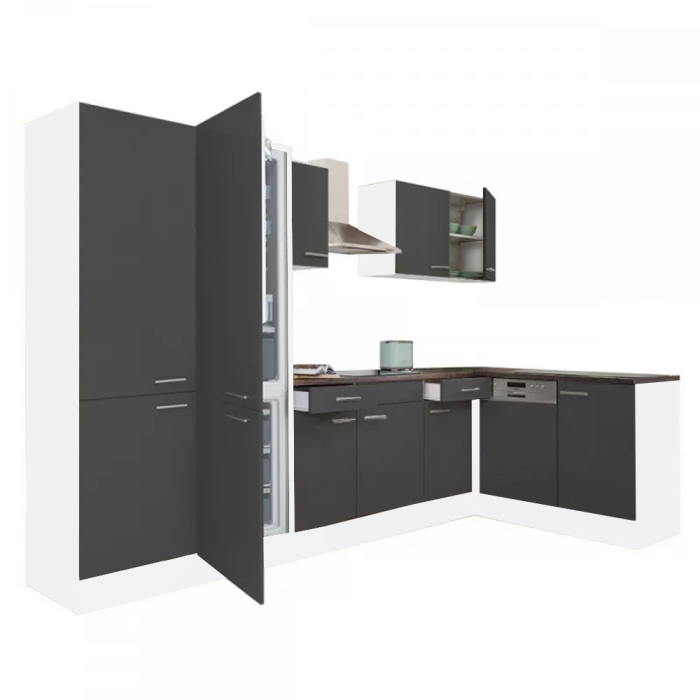 Setul include, de asemenea, un dulap de cămară cu rafturi și un frigider cu congelator în partea de jos.