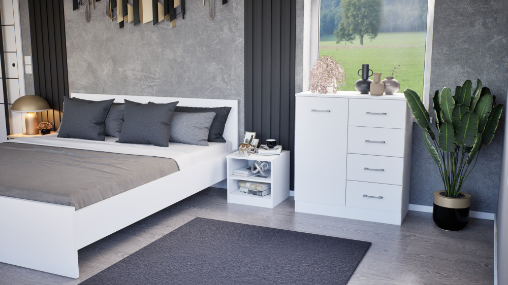 Comoda Miami, cu fața și corpul său alb, conferă puritate și eleganță spațiului, în timp ce materialul de calitate al plăcii de mobilier garantează durabilitate și rezistență. Dimensiunile sale - 40 cm adâncime, 80 cm lățime, 92 cm înălțime - sunt ideale pentru orice cameră. Comoda are 3 rafturi în spatele unei uși batante și 4 sertare suplimentare pe roți , perfecte pentru depozitarea hainelor, cărților sau chiar a echipamentelor de birou. Designul modern este completat de mânere din plastic cu efect cromat mat , care fac aspectul și mai curat.
