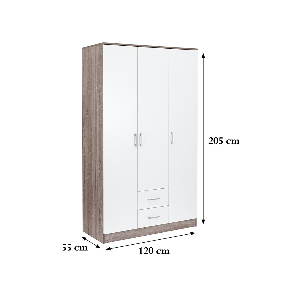 Elegantul față albă și efectul de lemn Corp de stejar York Combinația sa creează o armonie perfectă atât în sufragerie, cât și în dormitor. THE 205 cm înălțime, 120 cm lățime și 55 cm adâncime Un dulap este o alegere ideală pentru oricine dorește să își organizeze hainele și accesoriile.