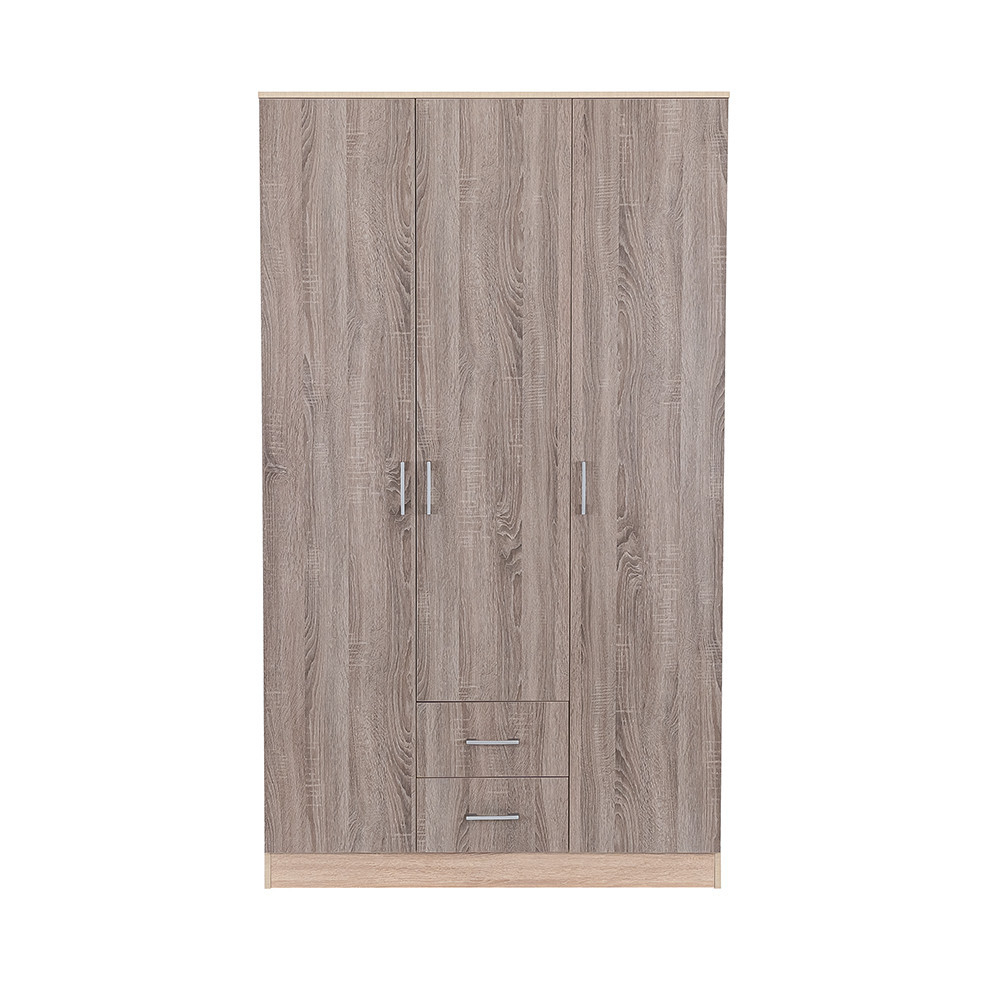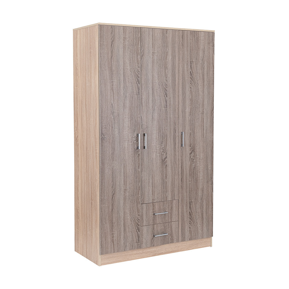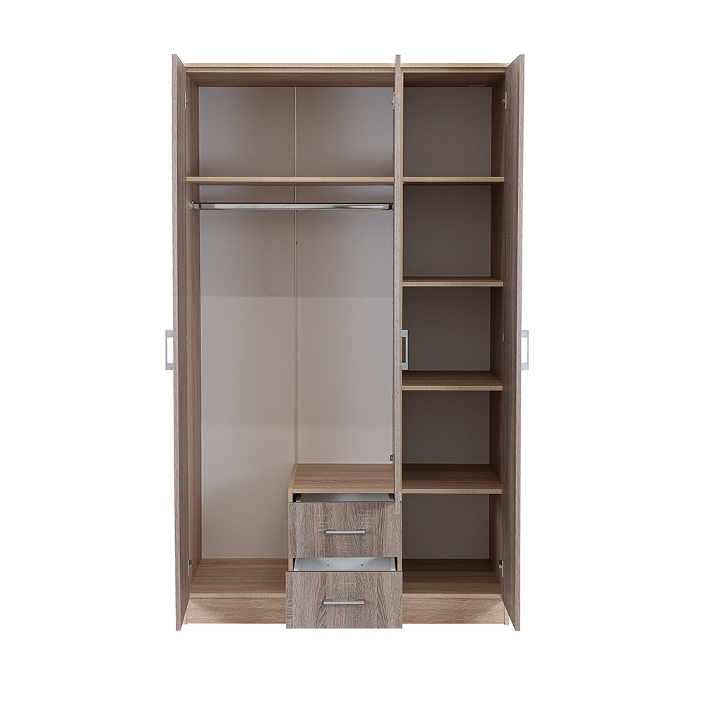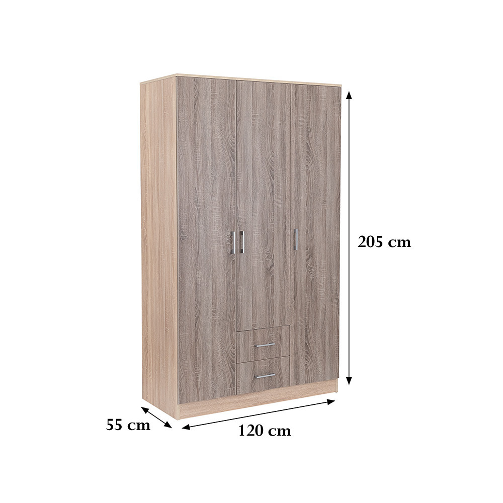 Elegantul fațadă din stejar Sonoma și efectul de lemn Corp de stejar York Combinația sa creează o armonie perfectă atât în living, cât și în dormitor. THE 205 cm înălțime, 120 cm lățime și 55 cm adâncime Un dulap este o alegere ideală pentru oricine dorește să își organizeze hainele și accesoriile.