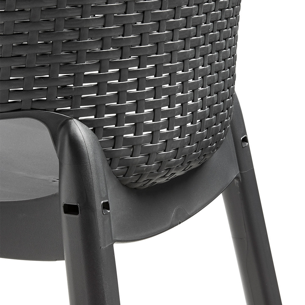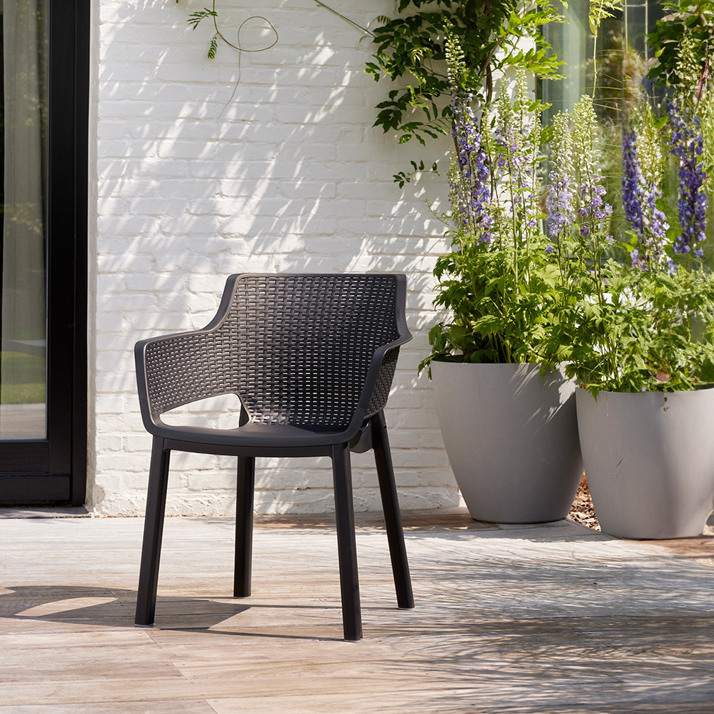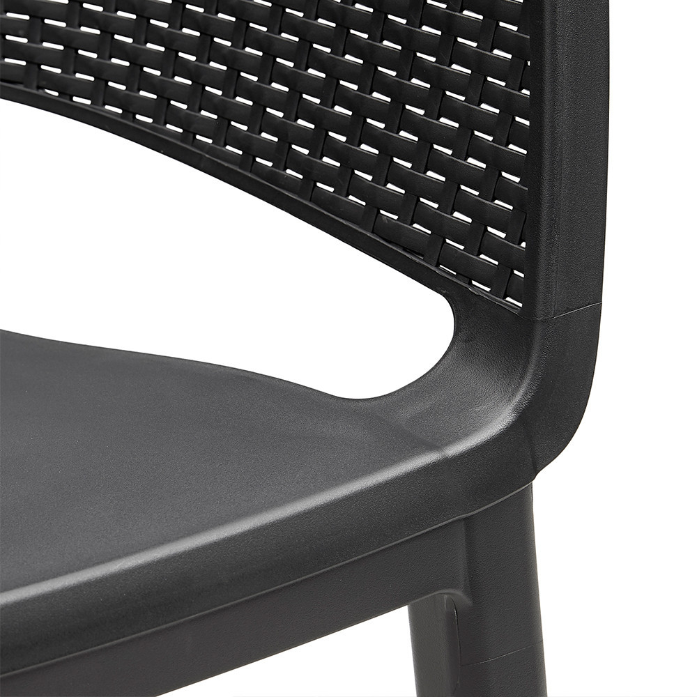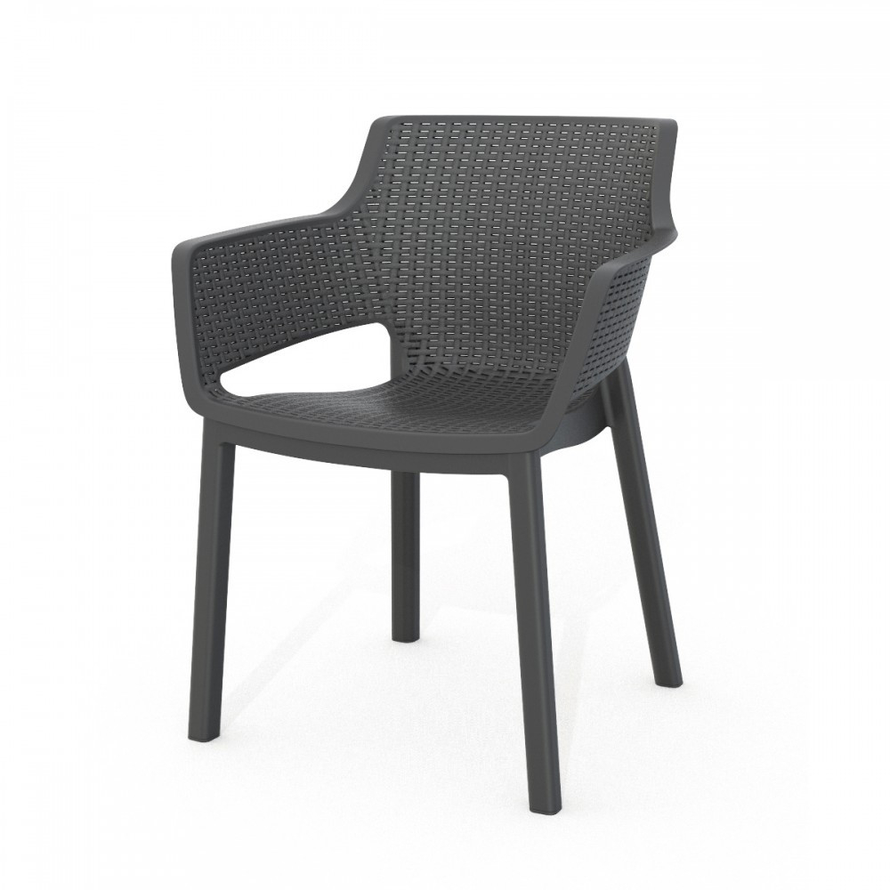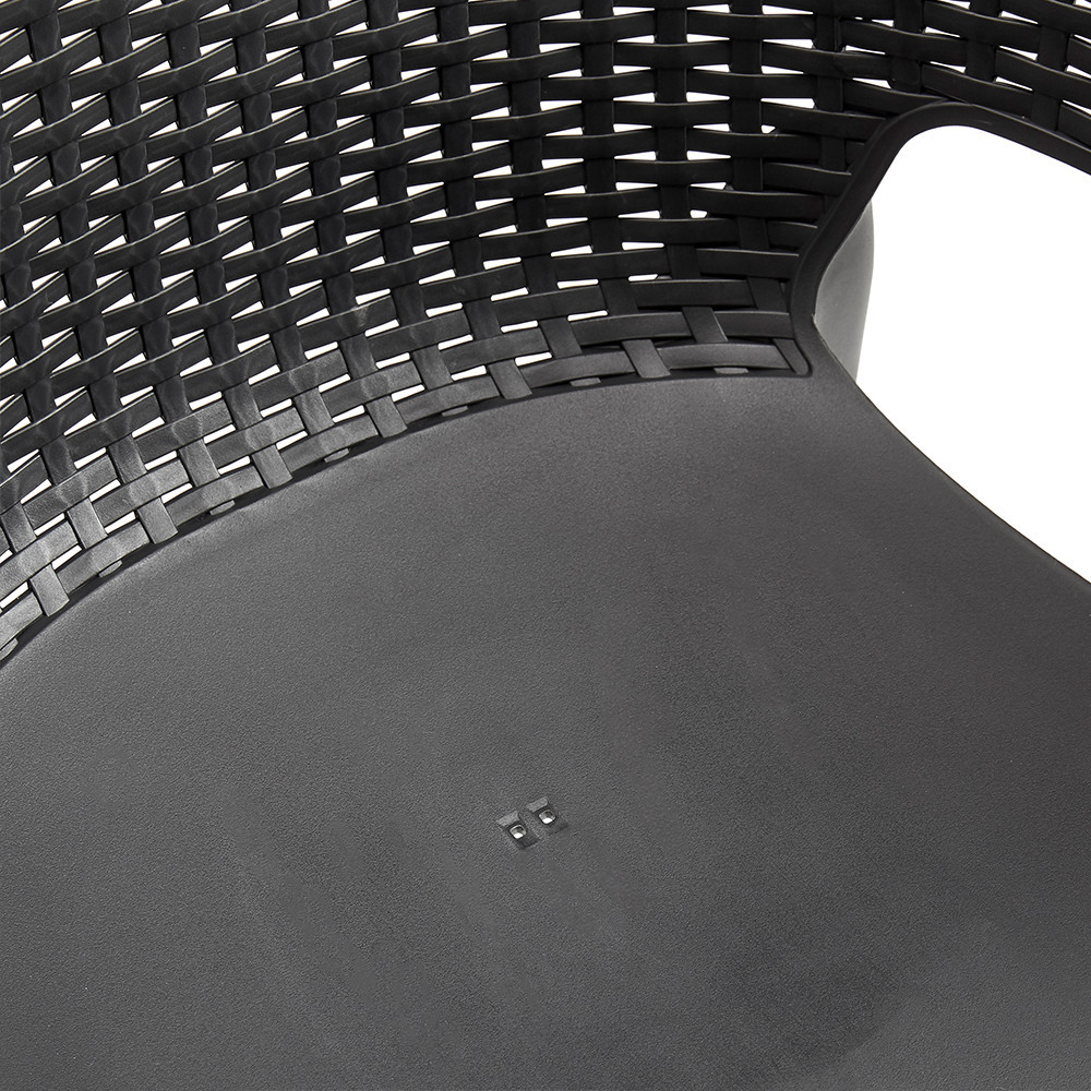 Scaunul de grădină din plastic Eva combină ergonomia cu designul modern. Scaunul cu efect de ratan, de culoarea grafitului, nu este doar remarcabil din punct de vedere estetic, ci oferă și confort în fiecare aspect al designului său. Conturul curbat al șezutului și spătarului oferă confort chiar și într-o seară lungă de vară.