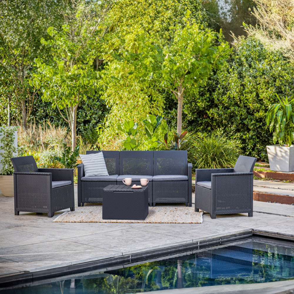 Acest set de mobilier de grădină cu efect de ratan în culoarea grafit include două fotolii, o canapea și o masă multifuncțională, toate fabricate din plastic rezistent la intemperii, așa că nu trebuie să vă faceți griji cu privire la efectele radiațiilor UV.
