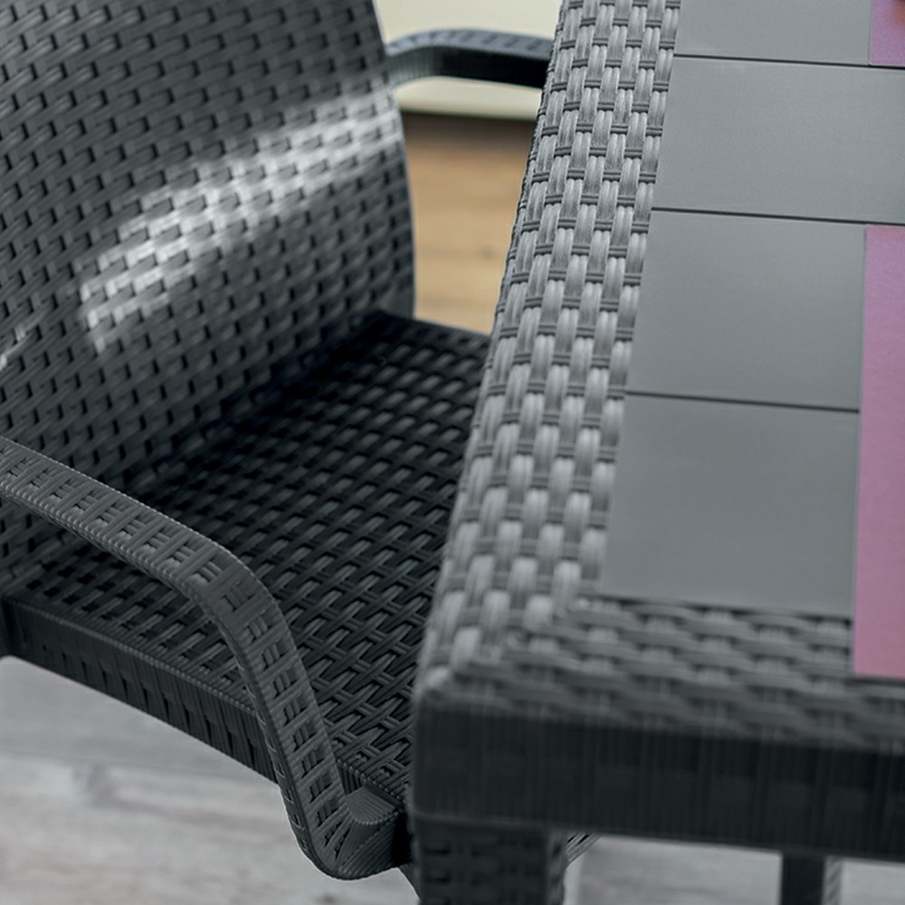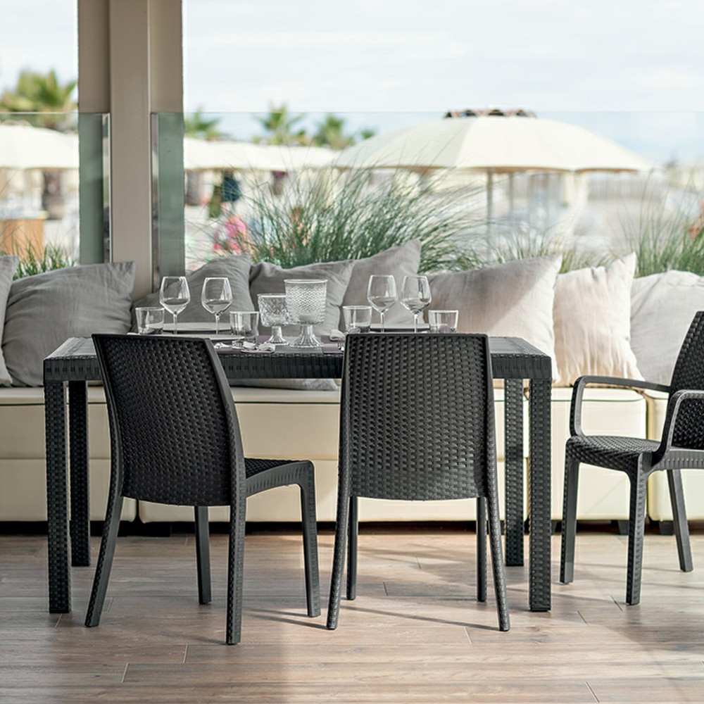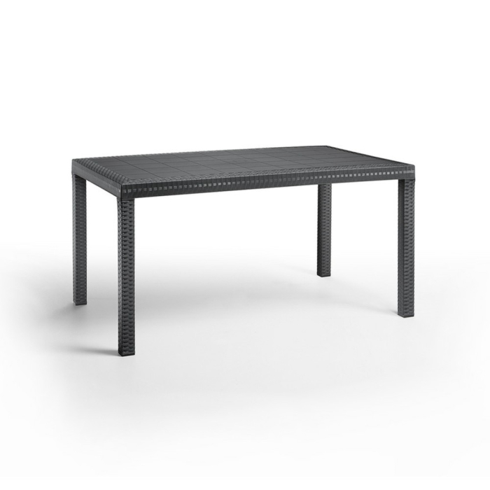 Această masă dreptunghiulară din ratan înalt , de culoare grafit , confortabilă și elegantă, cu dimensiunile de 150x90x74 cm, este fabricată în Italia. Fabricat din plastic rezistent la intemperii, poate fi amplasat și lângă piscină. O piesă de mobilier atemporală care va arăta ca nouă chiar și după ani de zile. Ușor de asamblat, nu necesită cunoștințe profesionale.