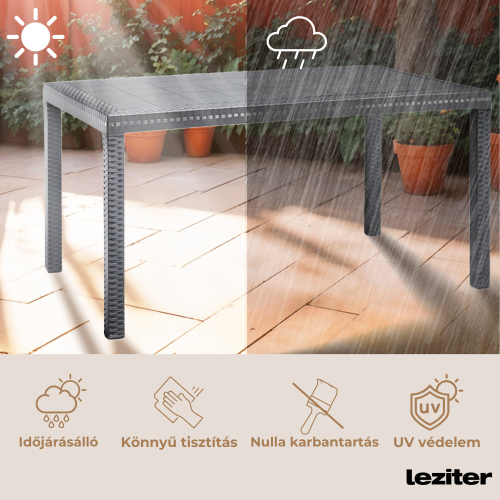 Material durabil: Fabricat din plastic rezistent la radiațiile UV și la condițiile meteorologice. Masa se potrivește ideal în orice spațiu din casă, creând un loc ideal pentru relaxare în aer liber. O suprafață inspirată de stilul modern este unul dintre avantajele estetice ale produsului.
