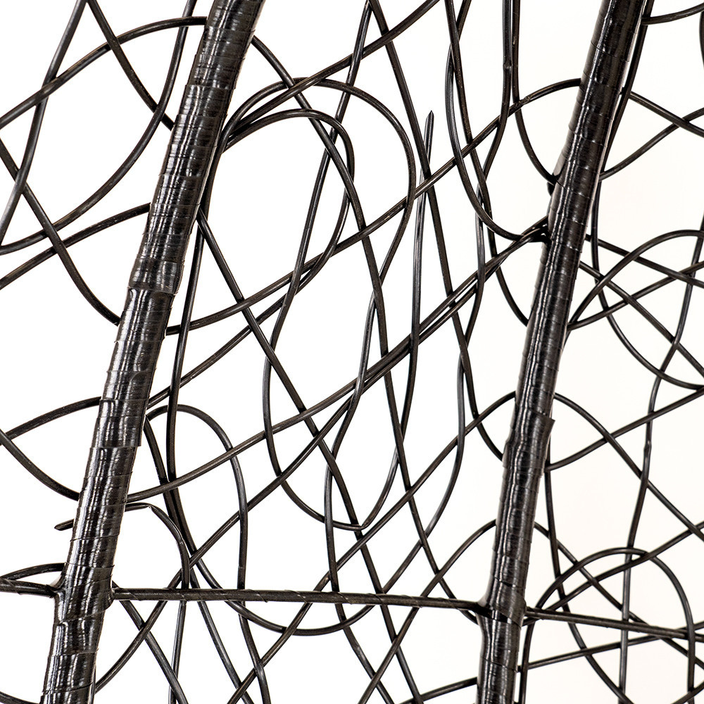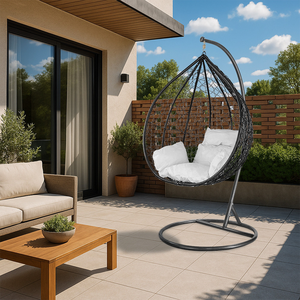 Coșul este fabricat din poliratan împletit dens, care, pe lângă beneficiile sale estetice, este și rezistent la intemperii. Materialul de rattan de culoare neagră este rezistent la condițiile meteorologice extreme, astfel încât hamacul își va păstra frumusețea în timp.