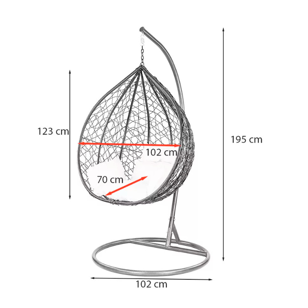 Fotoliul vine cu o pernă albă moale din două piese cu o husă de pernă impermeabilă detașabilă pentru o curățare ușoară. Cadrul de 195 cm înălțime și 102 cm diametru și coșul de 123 cm înălțime, 102 cm diametru și 70 cm adâncime oferă un loc confortabil pentru relaxare.