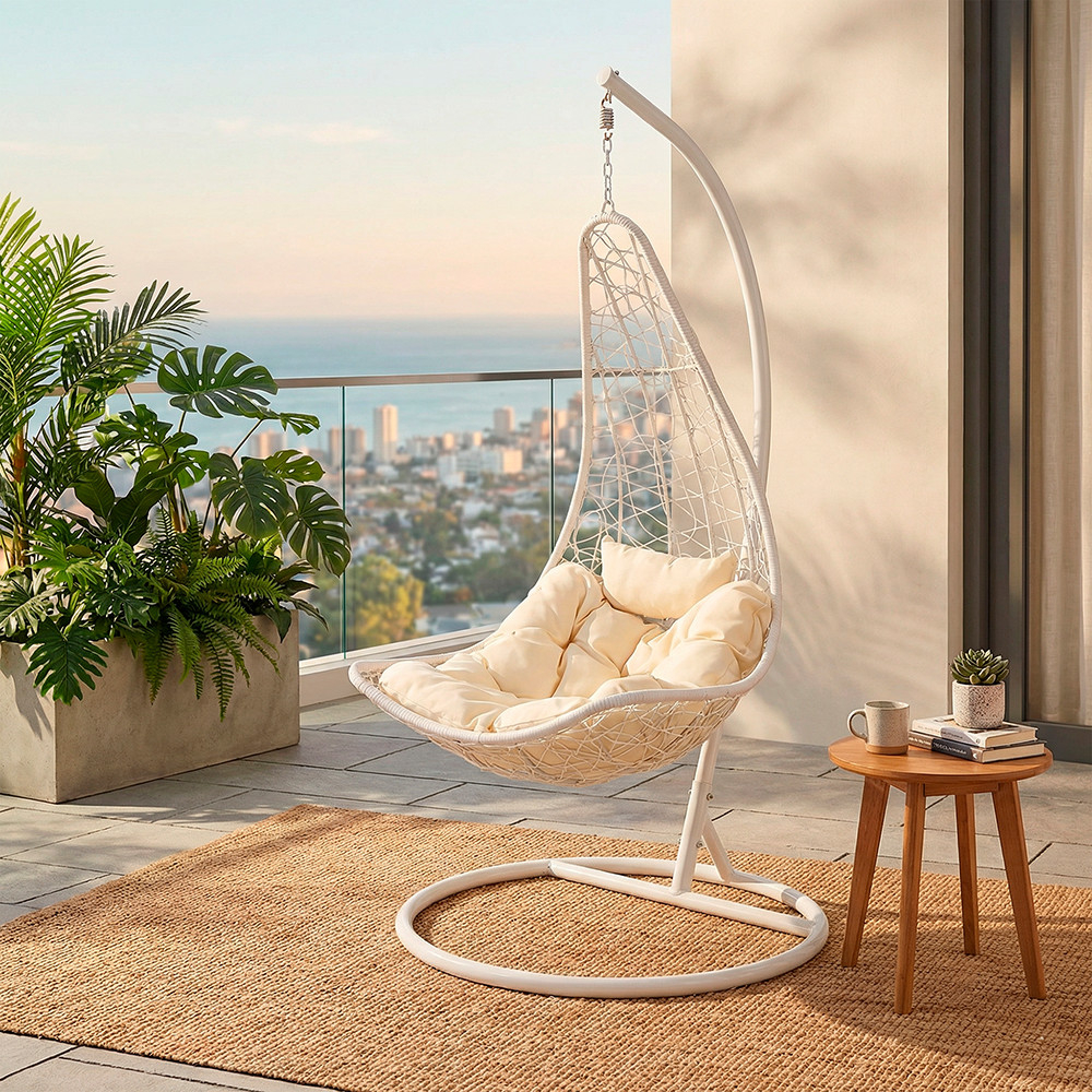 Coșul este fabricat din ratan PE împletit dens, care, pe lângă beneficiile sale estetice, este și rezistent la intemperii. Materialul de rattan de culoare albă este rezistent la condițiile meteorologice extreme, astfel încât hamacul își va păstra frumusețea în timp.