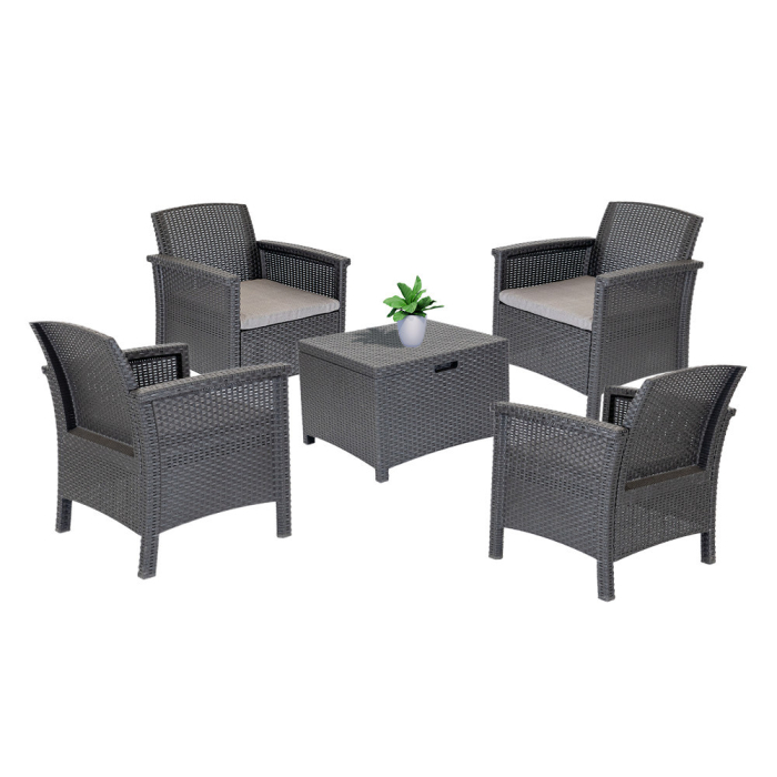 Setul este fabricat în Italia, datorită utilizării materialelor de calitate și designului său curat , conferă o atmosferămodernă și atemporală oricărui mediu exterior.Finisajul cu efect de rattan în grafit este elegant, dar se îmbină bine cu majoritatea stilurilor de grădină sau balcon.