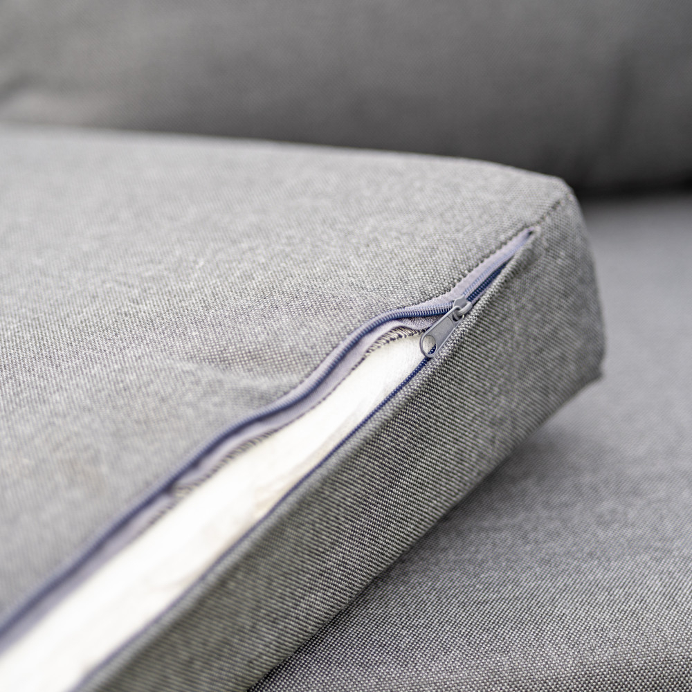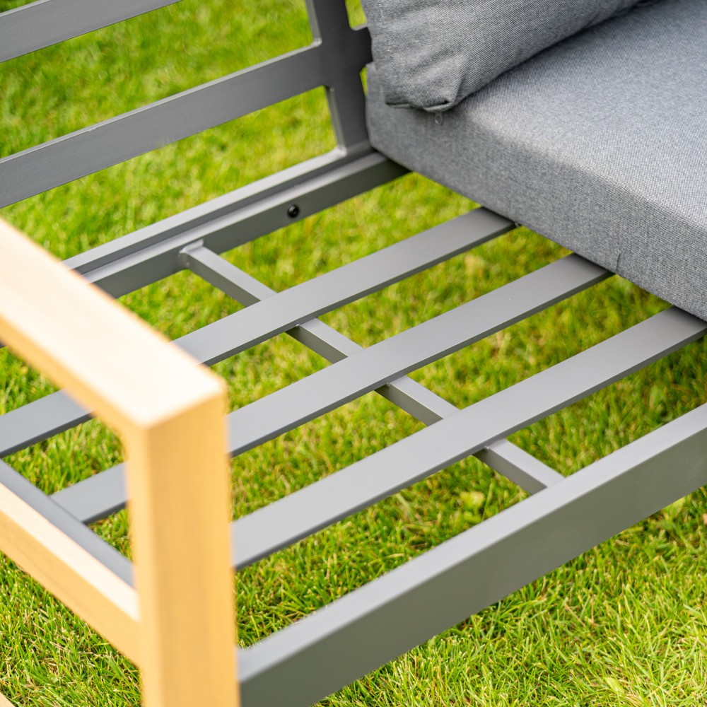 Designul unic al mobilei multiplică și specializează imitația furnirului cu model de lemn natural, care se regăsește pe cotierele și picioarele mobilei. Zona spațioasă de relaxare este completată de perne moi din poliester gri închis pentru un confort și mai mare.