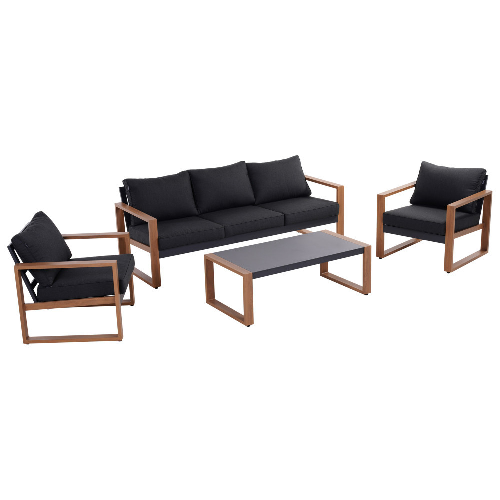 Stabilitatea mobilierului este asigurată de o ramă solidă din aluminiu, care se caracterizează printr-o durată lungă de viață, rezistență la coroziune și rezistență la intemperii. Setul este alcătuit din patru piese de mobilier, o canapea cu dimensiunile (LxAxÎ): 202x76x73,6 cm, două fotolii cu dimensiunile (LxAxÎ): 77x76x73,6 cm și o masă cu dimensiunile (LxAxÎ): 120x60x42 cm.
