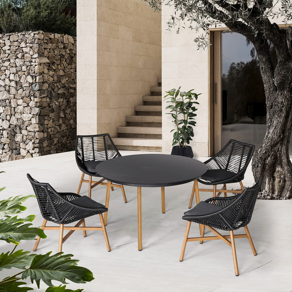 Setul de mobilier de grădină are o structură din aluminiu, ceea ce afectează semnificativ stabilitatea întregii structuri și este rezistent la condițiile meteorologice schimbătoare . Blatul are un aspect elegant și este ușor de curățat, ceea ce reprezintă un mare avantaj pentru mobila de sufragerie. Șezutele sunt fabricate din poliratan și prevăzute cu perne din poliester, ceea ce sporește semnificativ confortul utilizării lor. Picioare de mobilă pictate manual în culori care imită lemnul. Datorită materialelor folosite, mobila va fi utilă timp de mai multe sezoane.