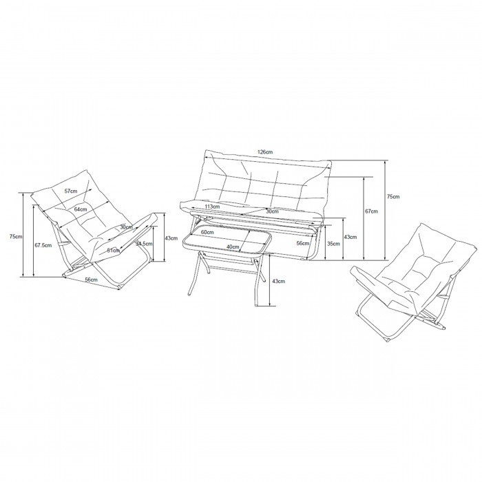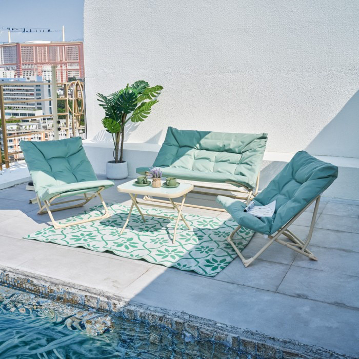 Cadrul mobilierului este fabricat din oțel durabil, asigurând stabilitate și durabilitate, făcând din set un companion de neînlocuit în timpul relaxării în grădină, campingului, picnicului sau bronzării. Blatul mesei, cu model elegant , este fabricat din sticlă, ceea ce nu numai că îi conferă un aspect estetic, dar este și ușor de curățat.