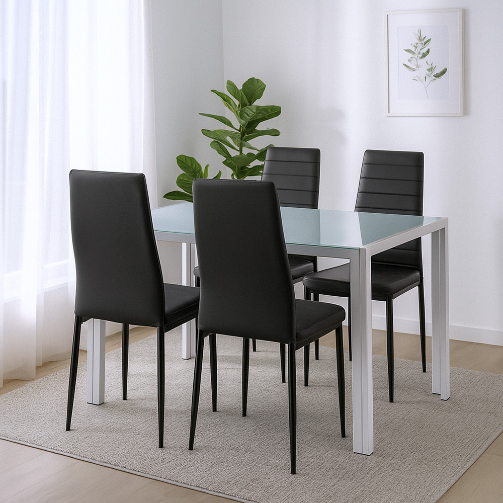 Suprafețele din sticlă fac ca spațiul să pară mai spațios, în timp ce structurile metalice rezistente asigură stabilitatea pe termen lung a mobilierului. Combinația de 4 scaune confortabile și o masă spațioasă este alegerea perfectă pentru cinele în familie, întâlnirile cu prietenii sau chiar mesele de zi cu zi.