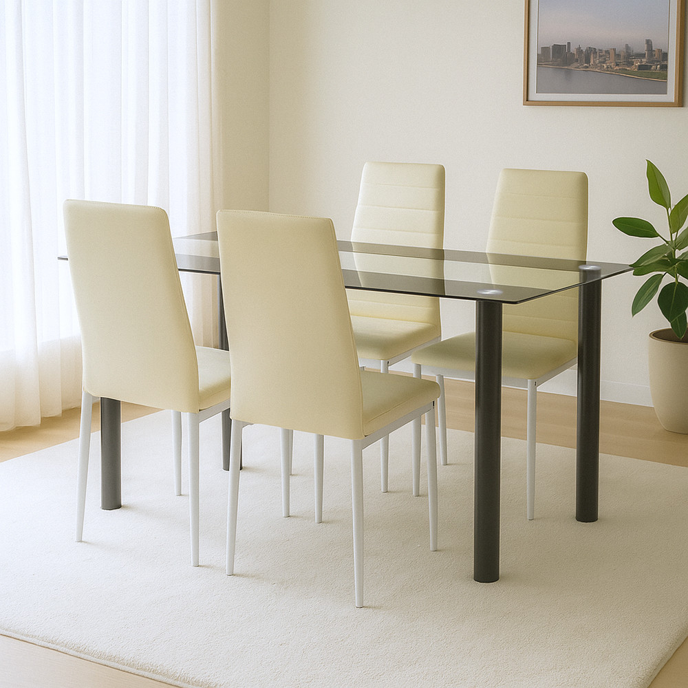 Blatul mesei din sticlă călită are o grosime de 8 mm, fiind rezistent la zgârieturi și căldură, în timp ce poate fi curățat printr-o singură mișcare ușoară. Dimensiunile sale - 140 x 80 x 75 cm - permit ca 4-6 persoane să stea confortabil în jurul său.