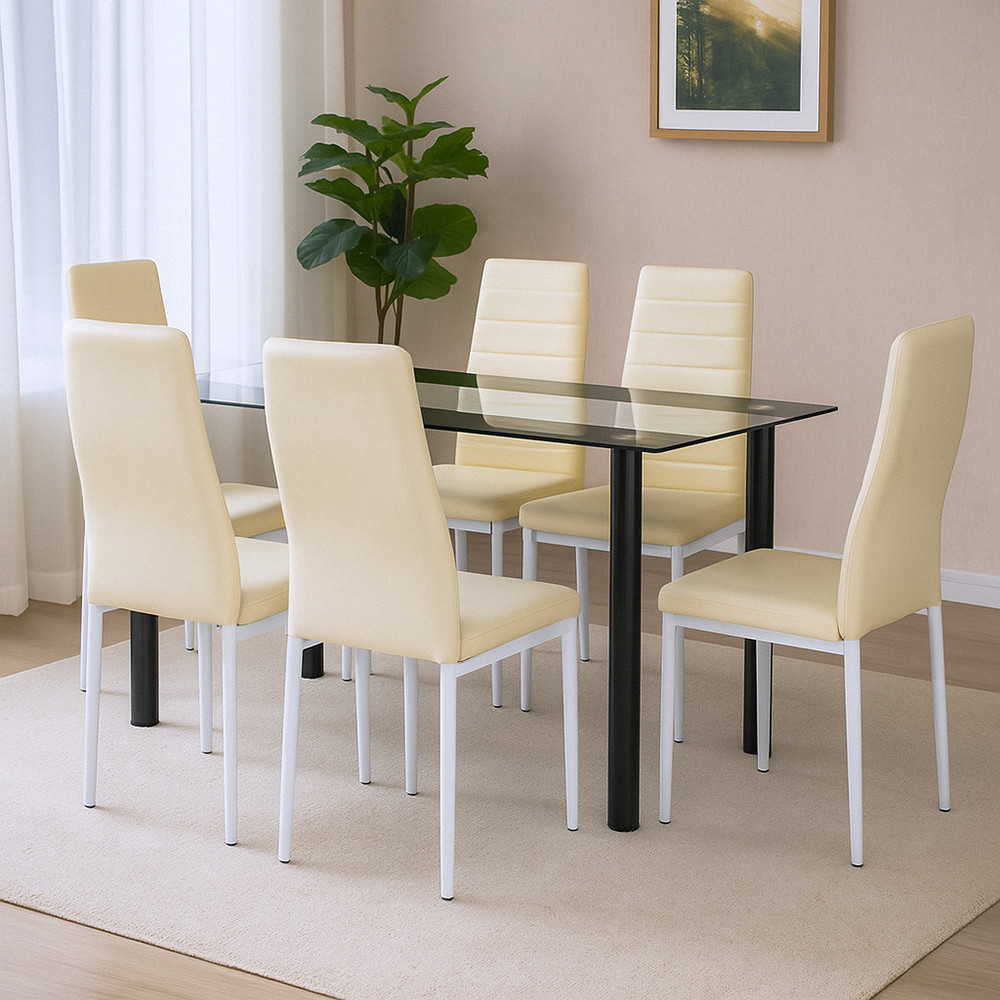 Blatul mesei din sticlă călită are o grosime de 8 mm, fiind rezistent la zgârieturi și căldură, în timp ce poate fi curățat printr-o singură mișcare ușoară. Dimensiunile sale - 140 x 80 x 75 cm - permit ca 4-6 persoane să stea confortabil în jurul său.