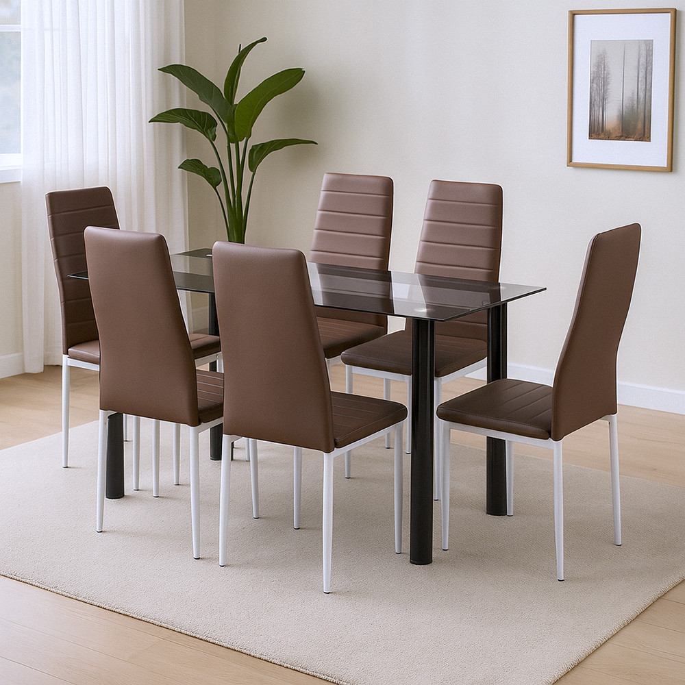 Venind ca parte a unui set Scaunele de dining TinoNOVA cu aspectul lor caracteristic se potrivesc perfect cu liniile moderne ale mesei Riona.Suprafața de ședere din piele textilă maro este elegantă, dar ușor de manevrat, în timp ce cadrul din metalalb asigură stabilitate și siguranță de lungă durată în utilizarea zilnică.