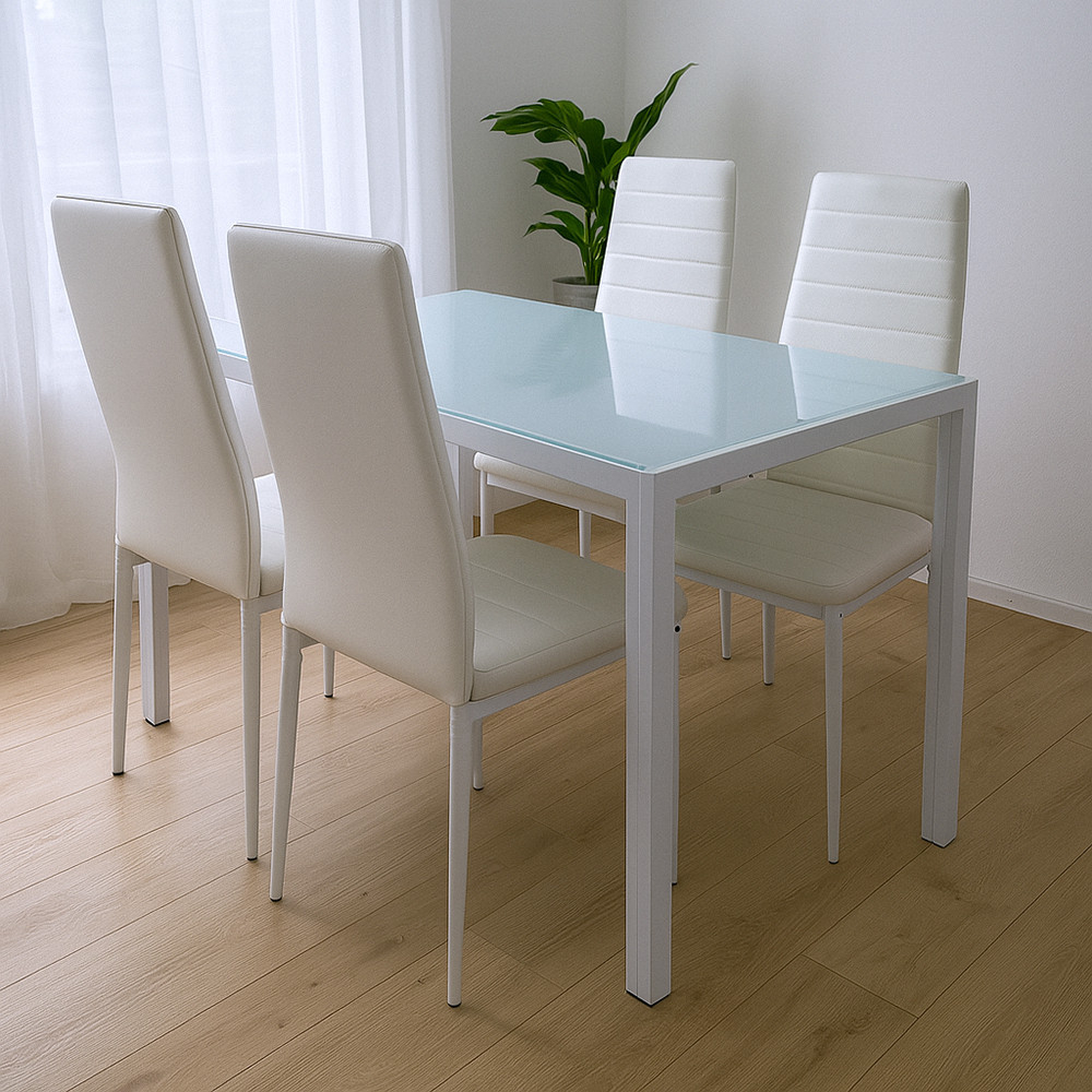 Suprafața de sticlă creează un efect elegant și este ușor de curățat. Picioarele metalice albe adaugă stabilitate mesei și conferă spațiului un aspect luminos și curat. Datorită dimensiunilor sale, se potrivește bine atât în sălile de mese mici, cât și în cele mari.