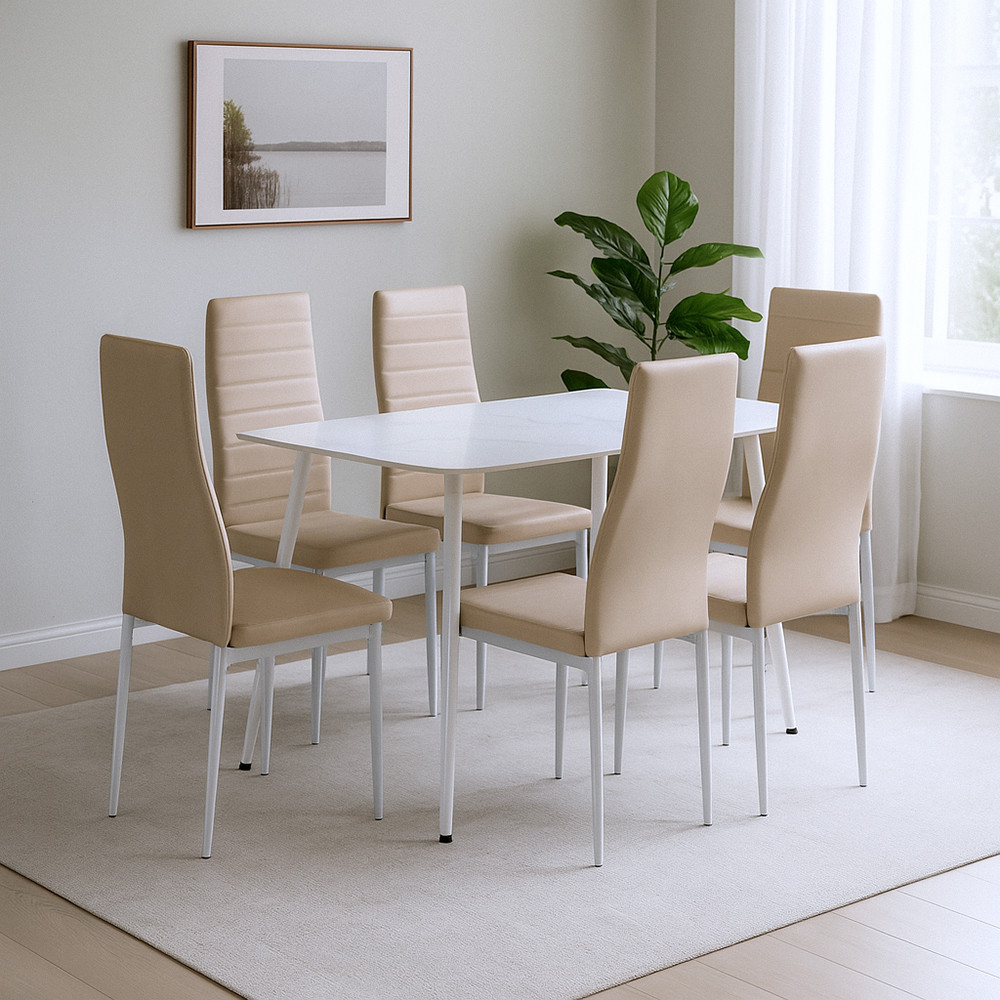 Scaunelede dining TinoNOVAdin setul Renton cu aspectul lor sofisticat și designul robust fac pereche perfectă cu masa Bora.Scaunele din piele textilă bej sunt moi, dar durabile, în timp ce picioarele din metal acoperit cu pulbere gri emană eleganță, garantând în același timp un suport fiabil.