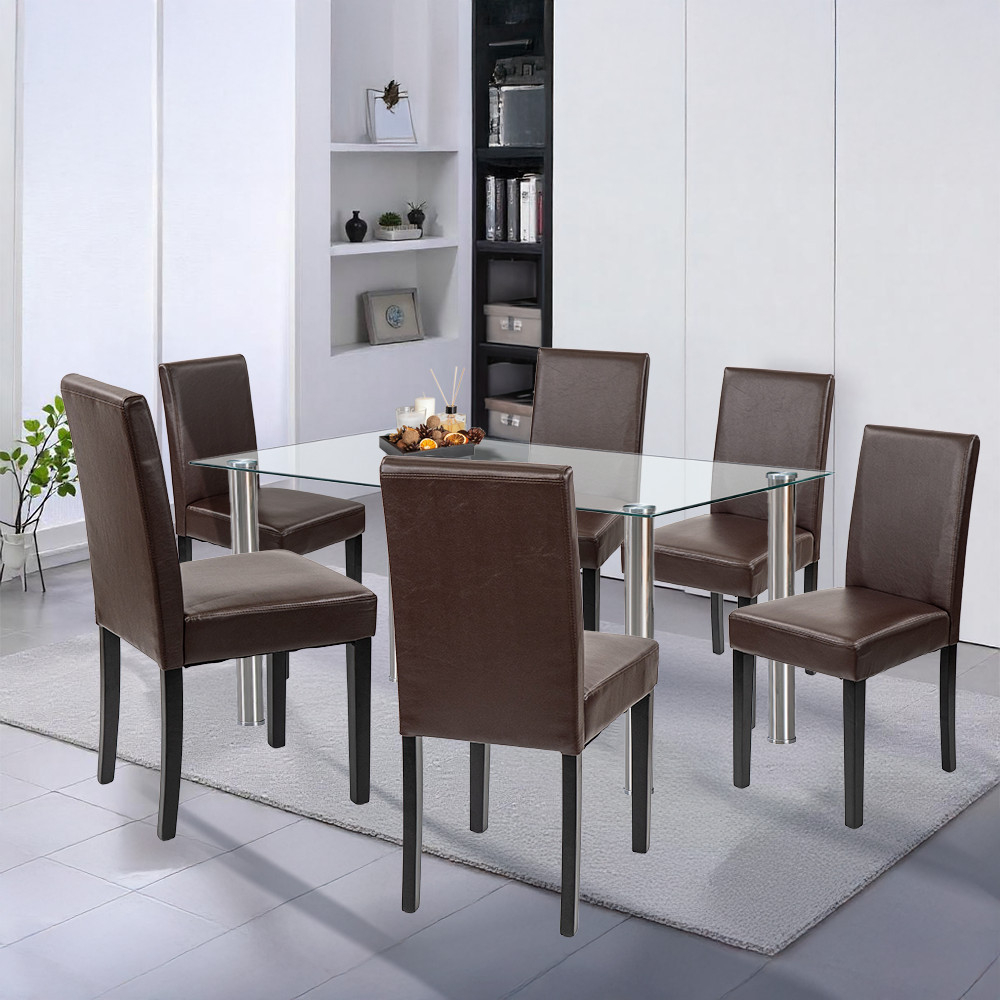 Setul include și șase scaune Leziter Kelly, tapițate cu piele ECO maro. Pe lângă aspectul elegant, aceste scaune sunt extrem de ușor de curățat. Șezutul din spumă cu grosimea de 4 cm oferă confort chiar și în timpul meselor mai lungi, iar picioarele stabile din lemn de pin, cu o capacitate de încărcare de 120 kg, garantează fiabilitate pe termen lung.
