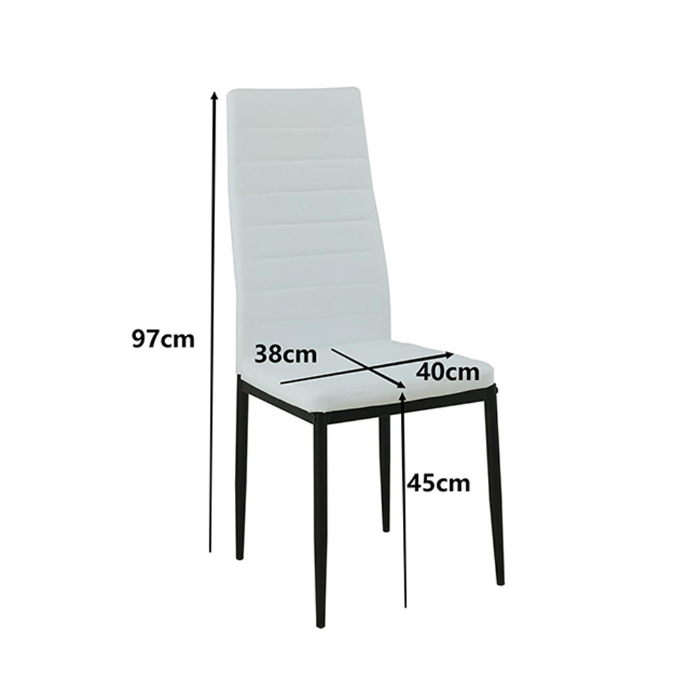 | Material | Blat din sticlă securizată, picioare metalice | scaun alb, picioare din fier vopsit în câmp electrostatic negru |