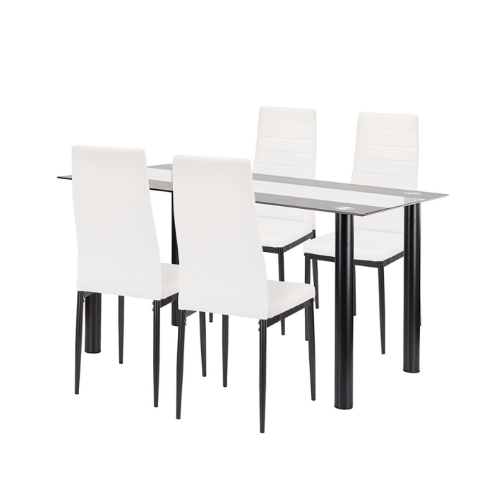 Combinația de culori alb și negru se armonizează perfect cu schema de culori a mesei din sticlă gri fum, făcând întregul set coerent și echilibrat din punct de vedere vizual.