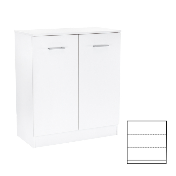 Comoda Miami, cu fața și corpul său alb, conferă puritate și eleganță spațiului, în timp ce materialul de calitate al plăcii de mobilier garantează durabilitate și rezistență. Dimensiunile sale - 40 cm adâncime, 80 cm lățime, 92 cm înălțime - sunt ideale pentru orice cameră. În spatele ușilor cu două canate care se deschid ale comodei se află 3 rafturi , perfecte pentru depozitarea hainelor, cărților sau chiar a echipamentelor de birou. Designul modern este completat de mânere din plastic cu efect cromat mat , care fac aspectul și mai curat.