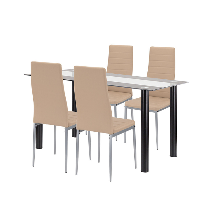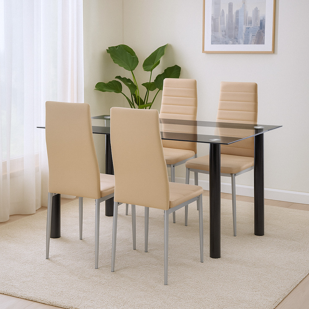 Combinația de culori bej-gri se armonizează perfect cu schema de culori a mesei din sticlă gri fum, făcând întregul set coerent și echilibrat din punct de vedere vizual.