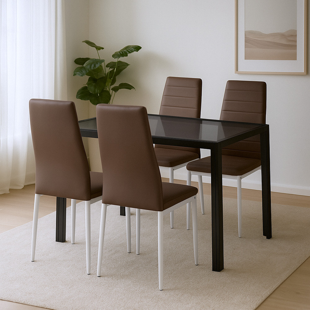 Set de sufragerie Nicole 4+1 - Eleganță maro curată cu masă din sticlă călită și scaune de sufragerie moderne