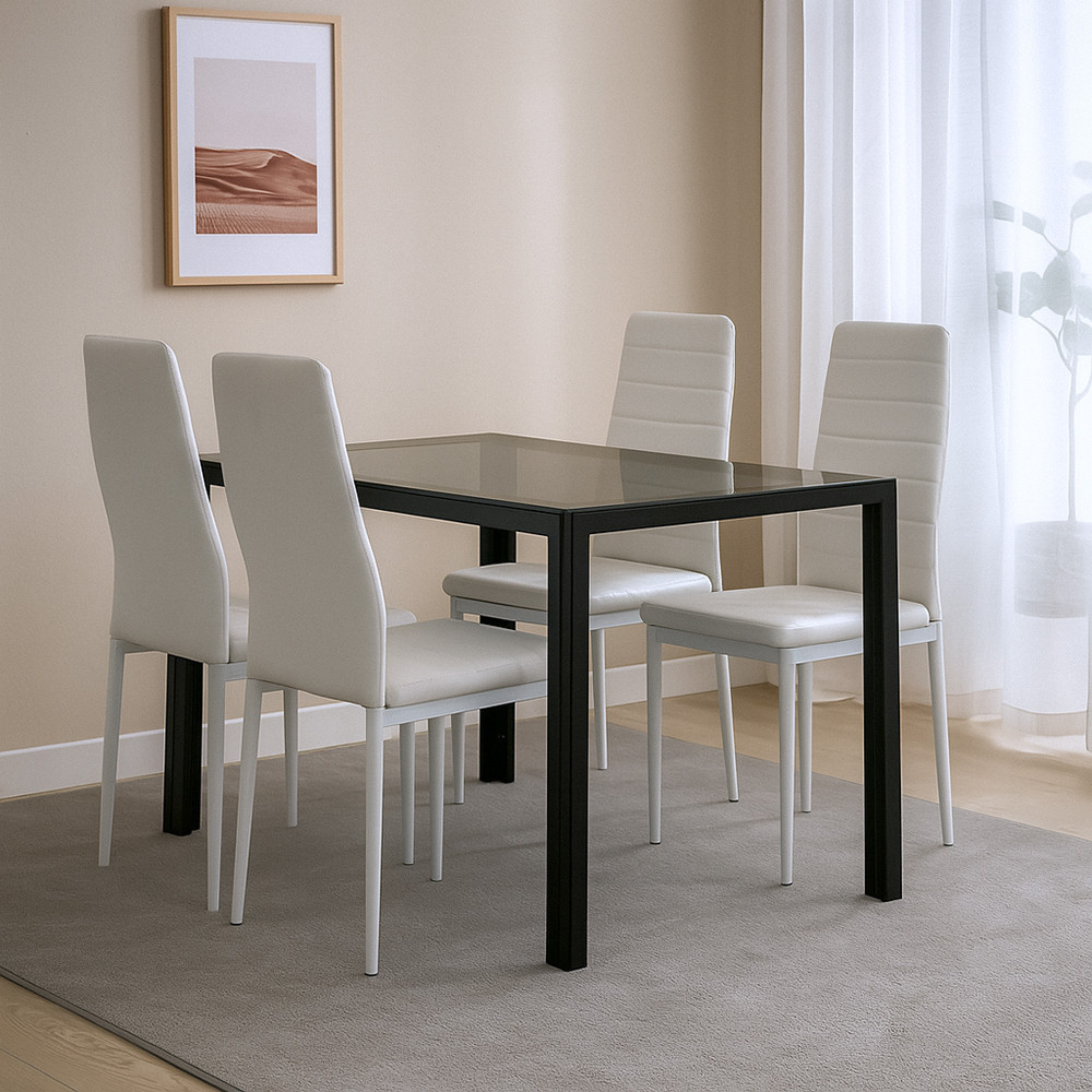Setul de sufragerie Nicole 4+1 este o alegere excelentă pentru cei cărora le plac tonurile puternice, închise, dar care nu doresc să facă compromisuri în ceea ce privește confortul și funcționalitatea.Masa de sticlă gri fumși scaunele de sufragerie albe creează o unitate armonioasă care se potrivește perfect în interioarele moderne, minimaliste sau în stil industrial.