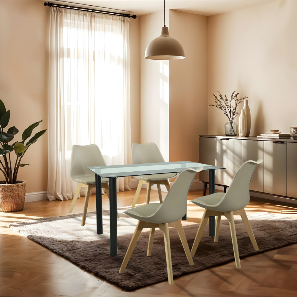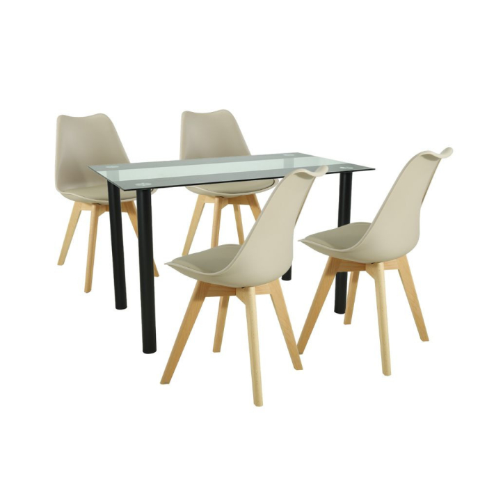 | Material | Blat de masă din sticlă securizată, cadru din oțel | Șezut bej PP, tapițerie bej PVC, picioare din lemn de fag |