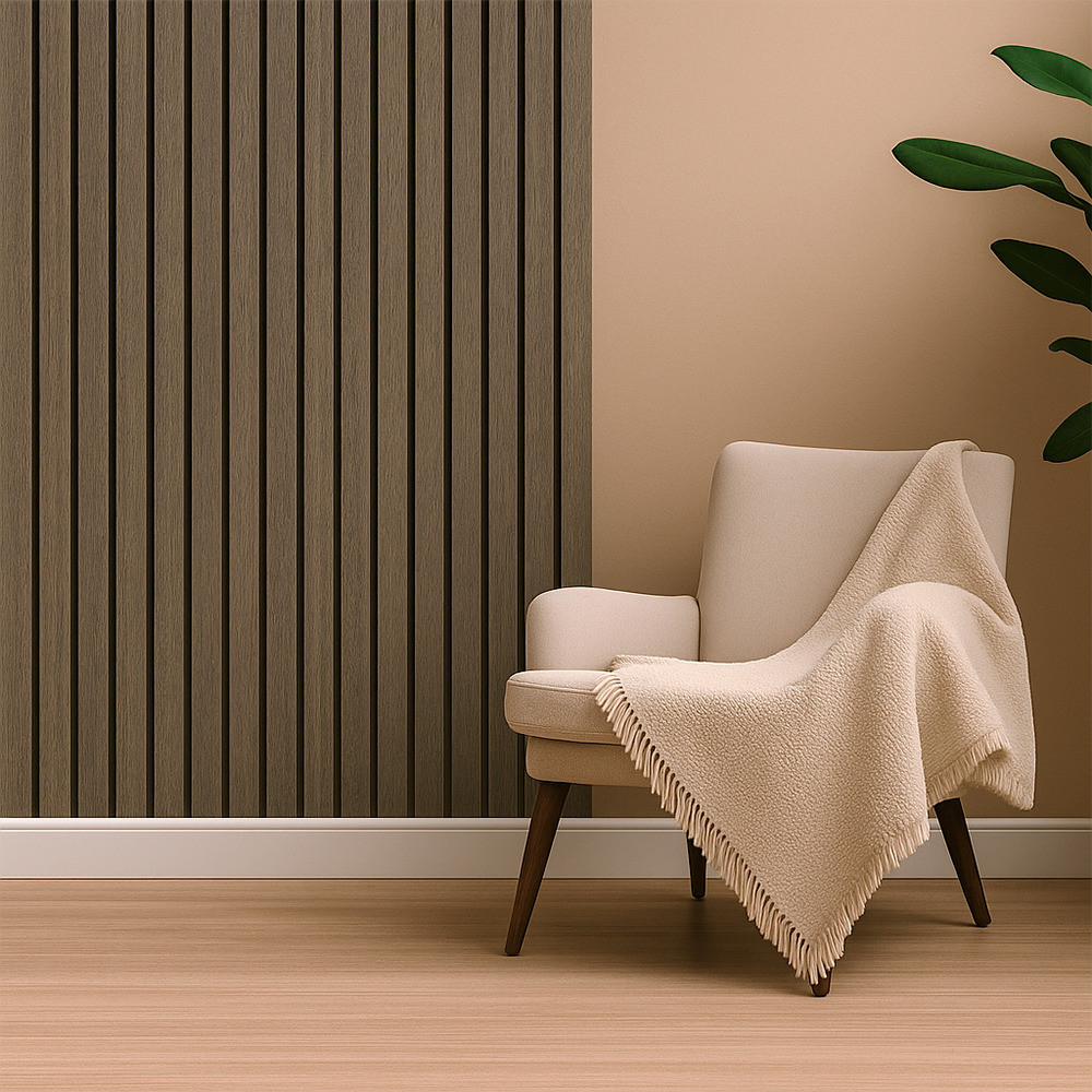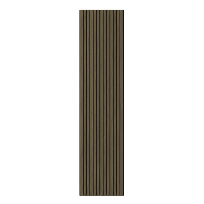 Lamelele late de 25 mm cu spații de 15 mm creează un model modern, ritmic, care îmbunătățește absorbția și dispersia undelor sonore. Fundalul acustic închis la culoare accentuează eleganța nuanței de stejar măsliniu, în timp ce fixarea ușoară permite instalarea pe perete sau tavan în locuințe, birouri și spații de ospitalitate.