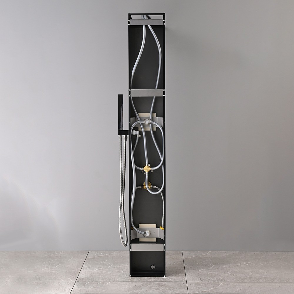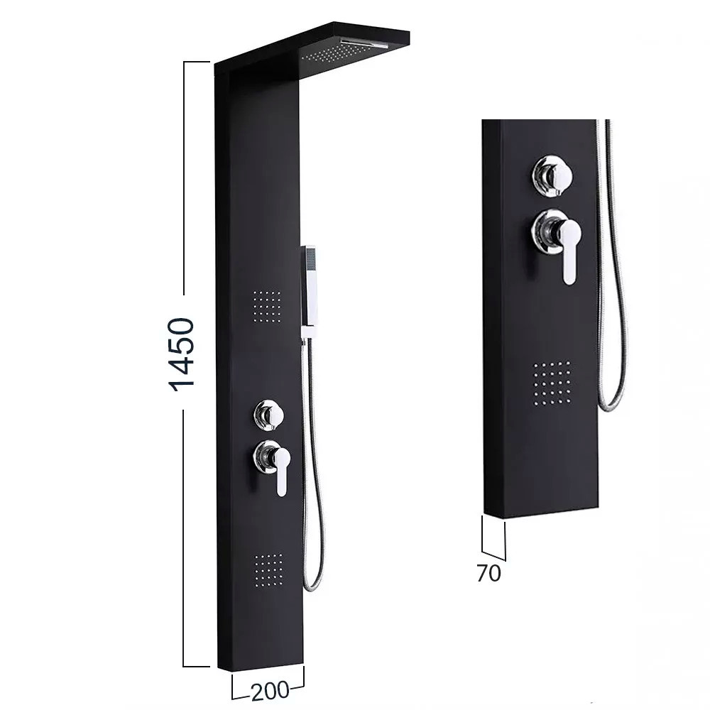 Panoul de duș cu hidromasaj Malaga Black este o soluție uimitoare și modernă pentru băi, oferind o experiență luxoasă în timpul dușului. Acest panou de duș este special conceput pentru confort și relaxare, în timp ce designul său elegant și bogat în caracteristici îl face parte din interiorul băii dumneavoastră. Panoul de duș măsoară 145 x 20 x 7 cm . Materialul este un aliaj de aluminiu vopsit, care este rezistent și durabil, fiind în același timp ușor și menținându-și aspectul estetic pe termen lung. Această alegere modernă de materiale garantează durata lungă de viață a panoului de duș.