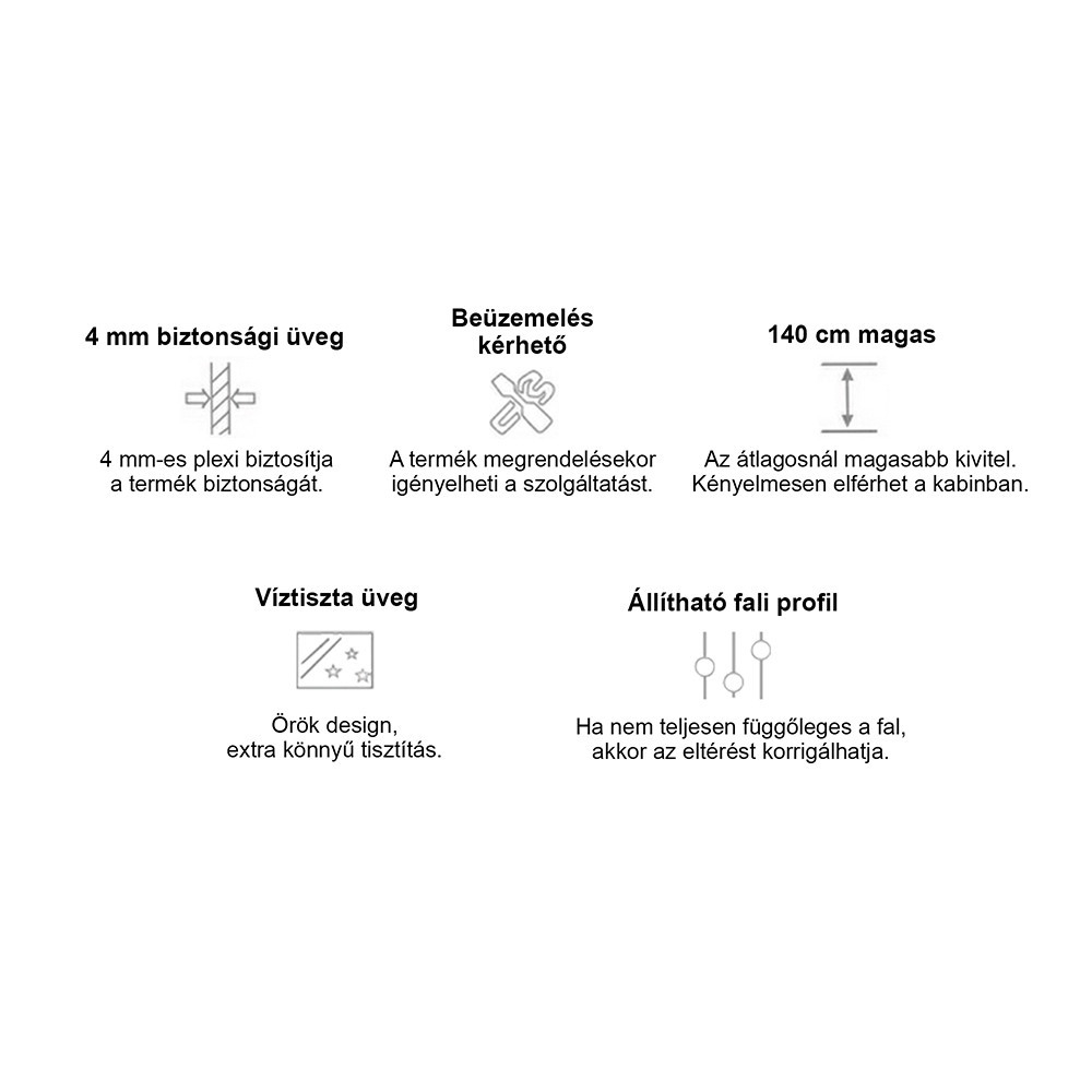 Paravanul de baie Eva are multe caracteristici pozitive. Este echipat cu o duză de apă inferioară care previne scurgerile de apă. Sticla securizată de 6 mm este fabricată cu un nano-acoperire care previne aderarea pe sticlă a petelor și depunerilor de calcar. Profilul pivotant montat pe perete permite o deschidere ușoară și fără probleme, iar paravanul de baie este, de asemenea, echipat cu un mecanism de ridicare .