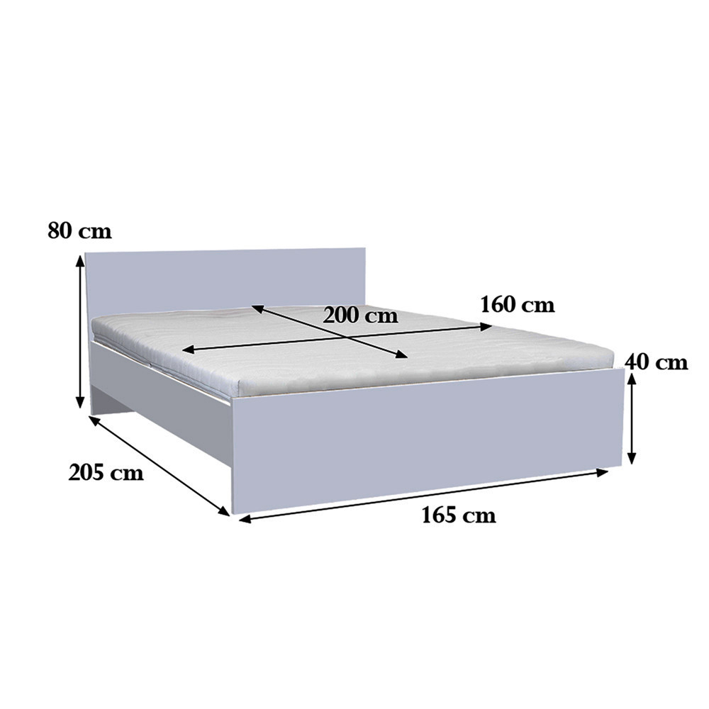 Dimensiuni Cadru de pat: 205 x 165 cm, Noptieră: 80 x 165 cm, Saltea (dimensiune recomandată): 200 x 160 cm.