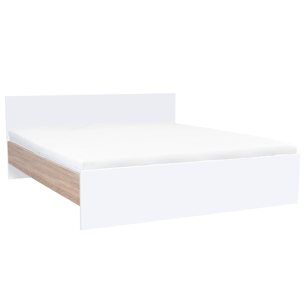 Patul Miami este fabricat din lemn de mobilier de înaltă calitate, cu un bufet din stejar Sonoma, tăblie și măsuță laterală albe. Dimensiuni cadru pat: 205 x 165 cm. Dimensiuni tăblie pat: 80 x 185 cm. Dimensiunile saltelei care se potrivește în cadrul patului: 200 x 180 cm