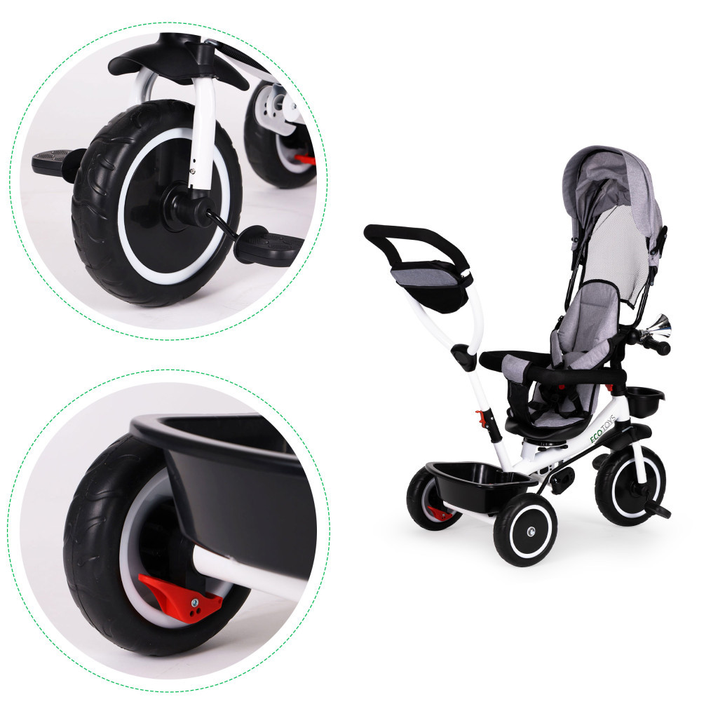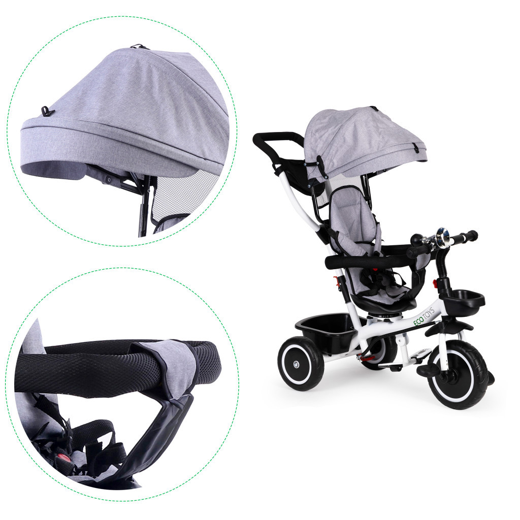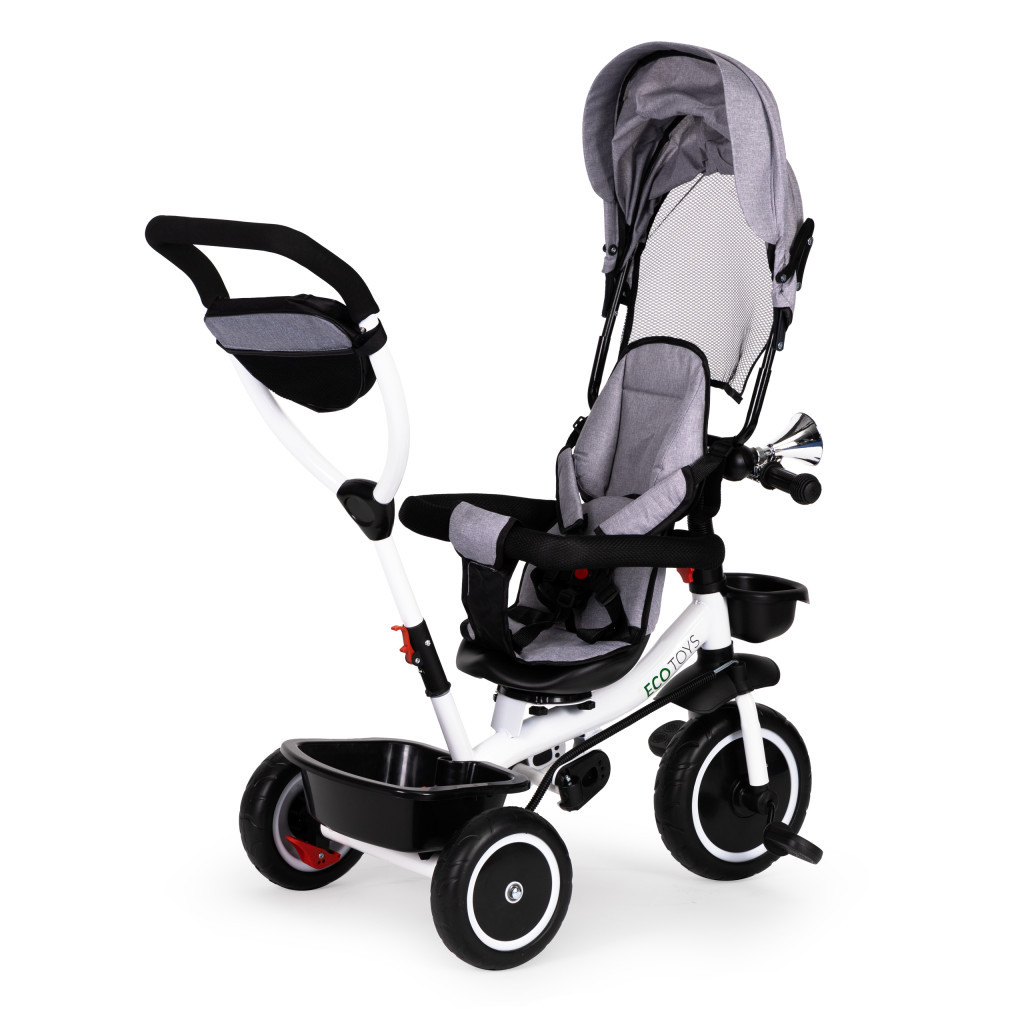 Bicicleta ECOTOYS combină o serie de soluții practice pentru a asigura o distracție sigură pentru copilul dvs. Bicicleta are un spătar moale și confortabil care îi permite copilului dvs. să stea confortabil, în timp ce centurile și balustradele îl împiedică să cadă de pe scaun. Acoperișul pliabil îi protejează de ploaie și soare. Cadrul special profilat și **scaunul rotativ** facilitează urcarea celor mai mici copii.