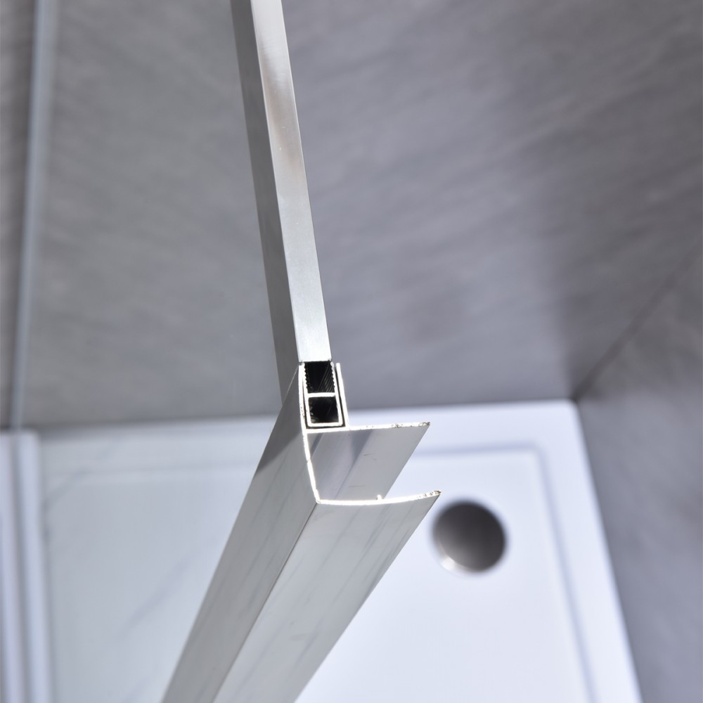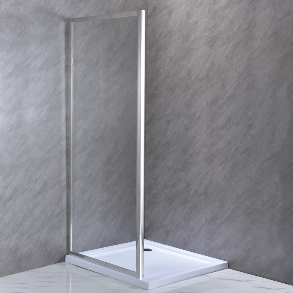 Peretele de duș este echipat cu o ramă din aluminiu cromat și sticlă securizată transparentă de 5 mm . Modelul are o lățime de 90 cm și o înălțime de 185 cm .