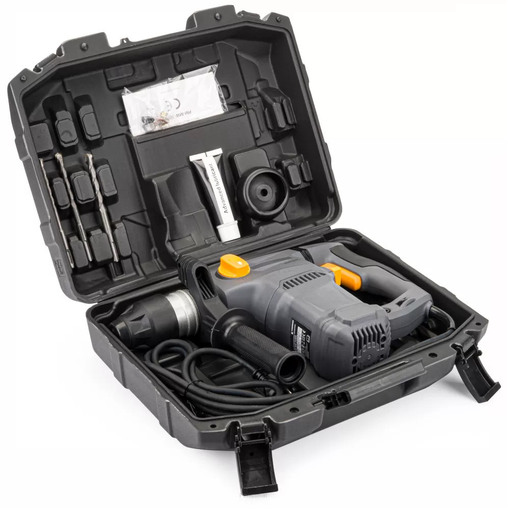 Ciocan rotopercutor POWERMAT PM-MU-2600M cu putere de 2600 W și sistem SDS-plus . Mânerul antivibrații AVH reduce vibrațiile în timpul utilizării.