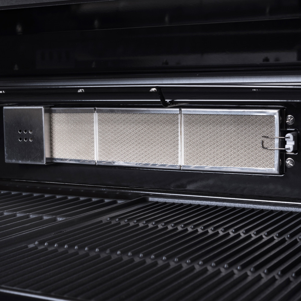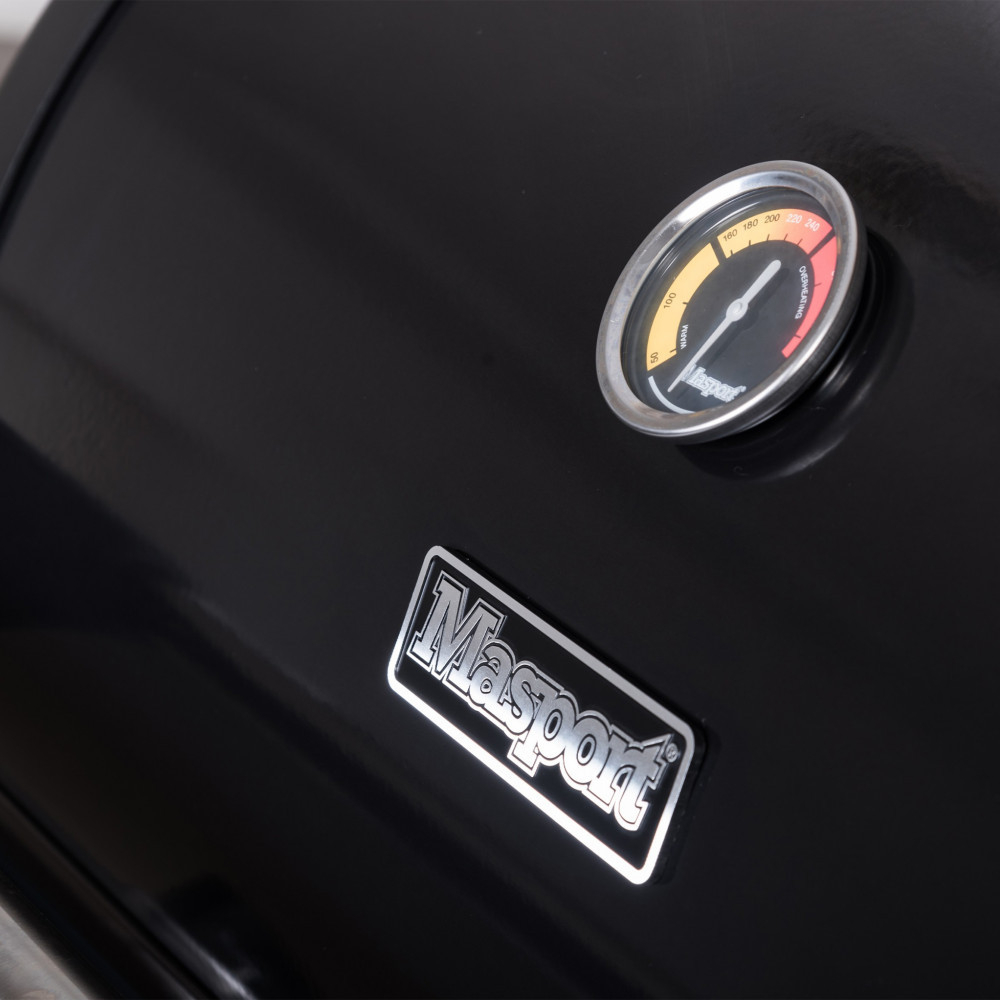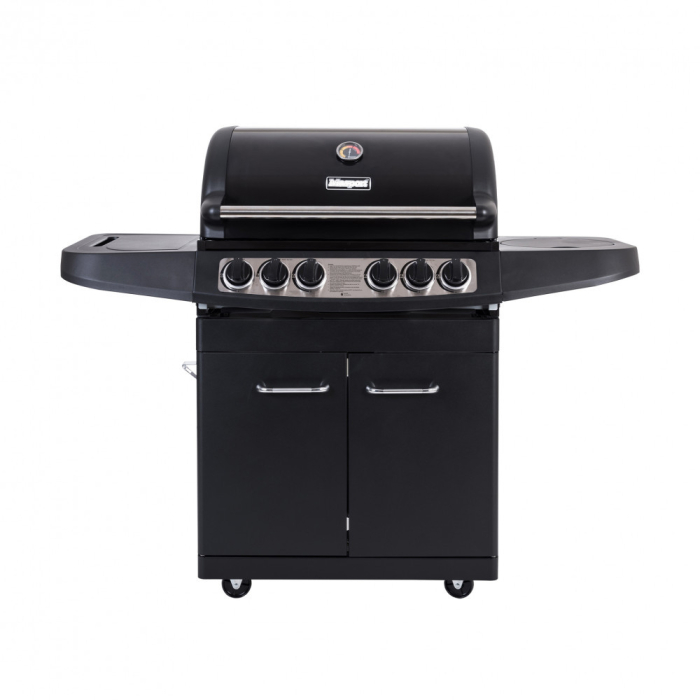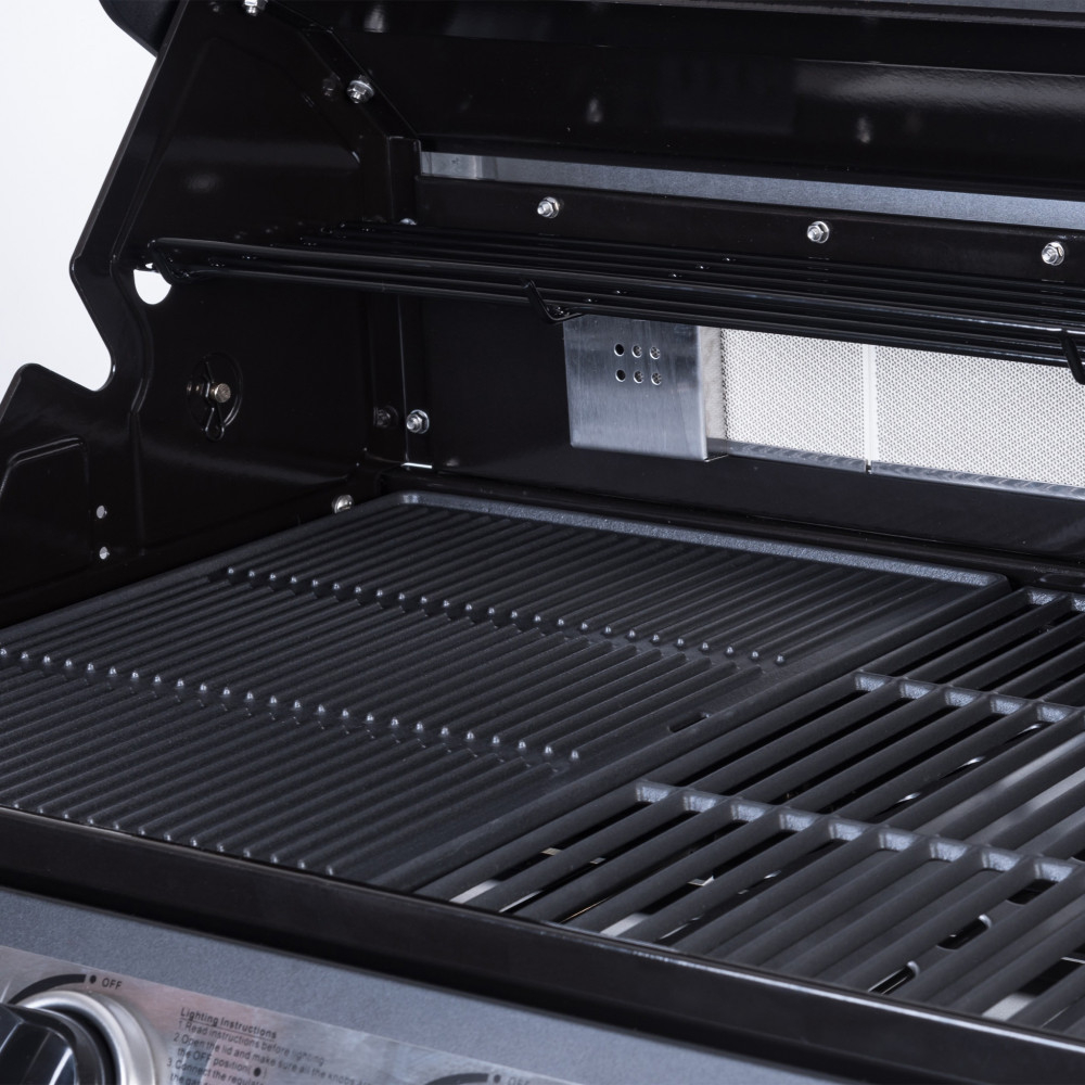 Acest grătar include și un arzător posterior ceramic cu infraroșu, care furnizează temperatura potrivită compartimentului de gătit din lateral. Sistemul de aprindere încorporat funcționează fiabil în timpul utilizării. Nivelul de gătire poate fi verificat pe afișajul de temperatură, care se află în capacul închis. Capacul, grătarul și placa de grătar sunt emailate, ceea ce asigură o durată lungă de viață.