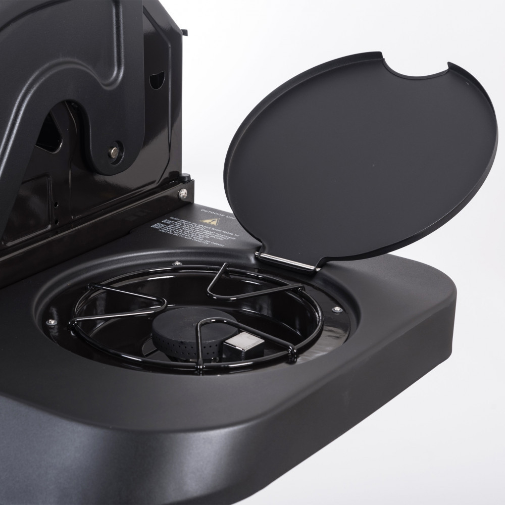 În partea dreaptă, există o plită ceramică separată pentru prepararea sau menținerea la cald a sosurilor sau a altor preparate. Există un compartiment de depozitare pe partea stângă. Există o suprafață suplimentară în compartimentul cuptorului pentru menținerea alimentelor calde. Un element mic, dar esențial, este desfăcătorul de sticle încorporat. Puteți depozita butelia de gaz într-un dulap inferior cu două uși, care se poate încuia. Grătarul are 4 roți pentru transport.