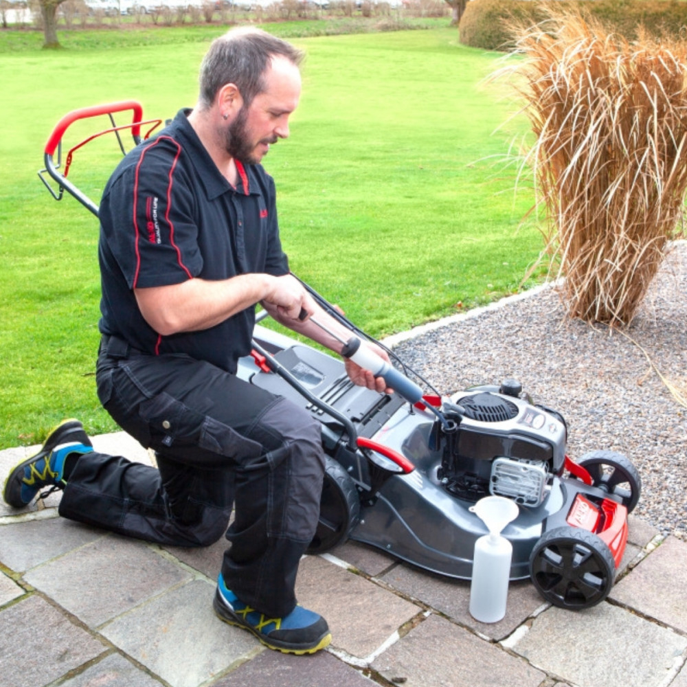 Pentru toate motocositoarele pe benzină, seringă de aspirație, pâlnie, rezervor Cu ajutorul pompei puteți aspira curat uleiul de motor vechi și îl puteți umple în rezervorul prevăzut. Pâlnia facilitează apoi umplerea cu ulei de motor nou Dacă motorul se strică, este prea târziu. Întotdeauna schimbați uleiul la timp!