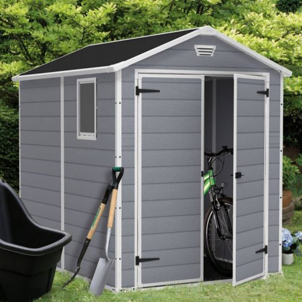 Spațioasa magazie Manor de 6x8 face organizarea spațiilor exterioare ușoară și atractivă. Combină pereți cu lambriuri din lemn, care necesită puțină întreținere, uși duble cu încuietoare pentru acces facil la bunuri, o podea pentru a păstra obiectele curate și uscate, ferestre fixe și guri de aerisire pentru lumină naturală și o circulație excelentă a aerului și un tavan înalt pentru mișcare liberă. Asamblarea este rapidă și ușoară, așa cum era de așteptat.